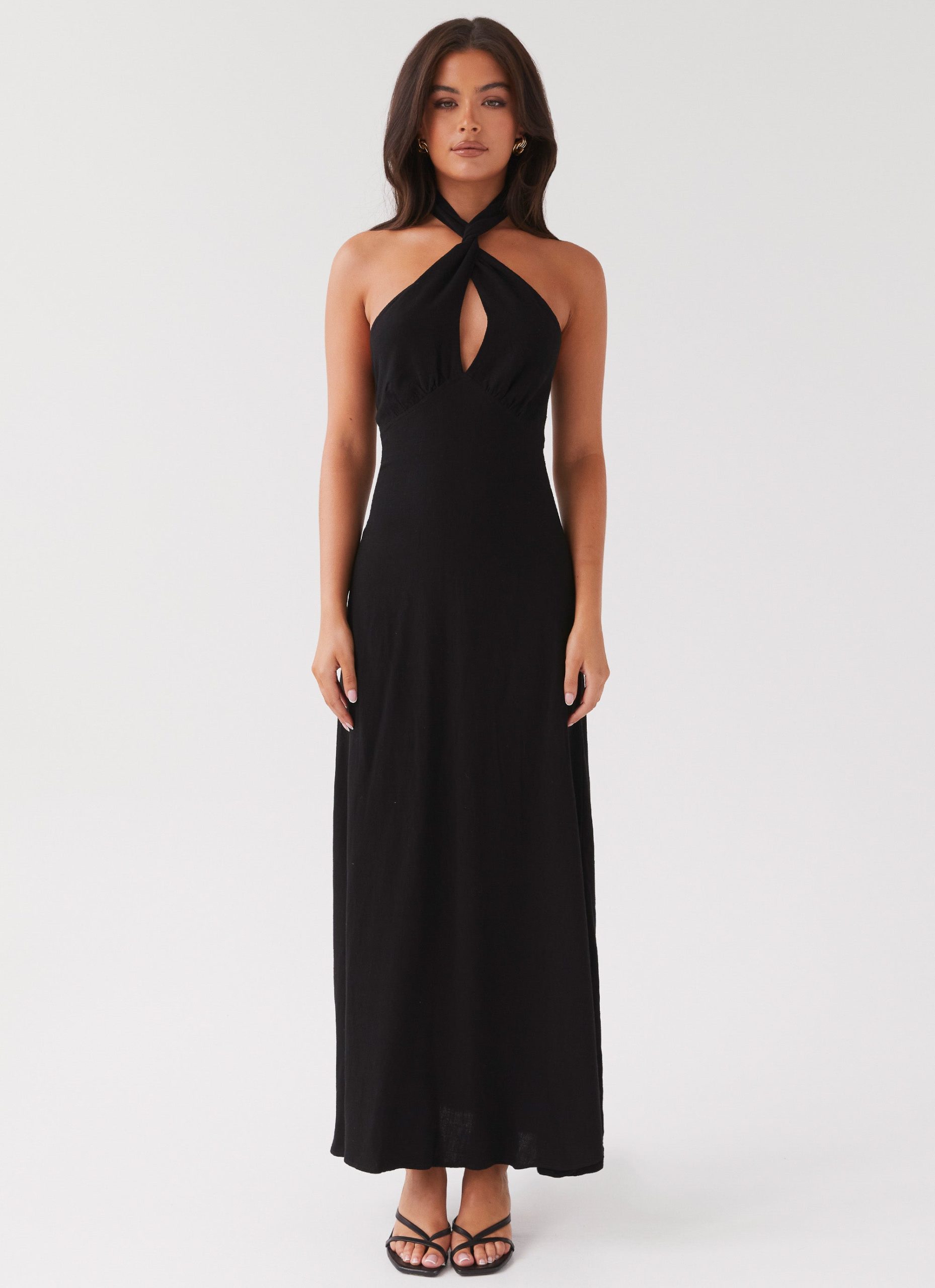 Introducing our best-selling Adrienne Linen Maxi Dress. now available in black. Featuring a gathered bust. halter neck. and keyhole cutout. it’s the epitome of effortless chic. This dress ensures you’ll stand out under golden skies and balmy nights.