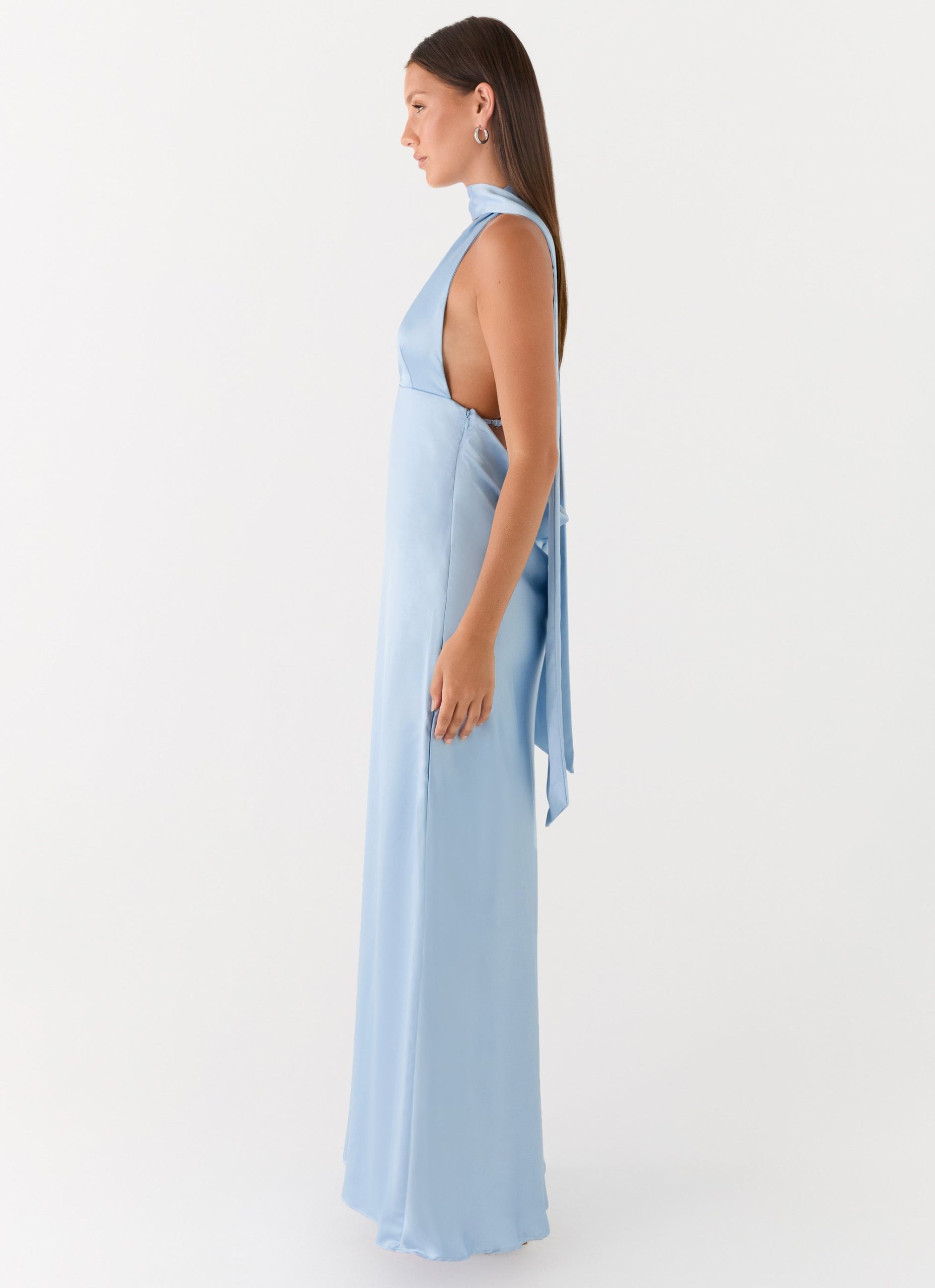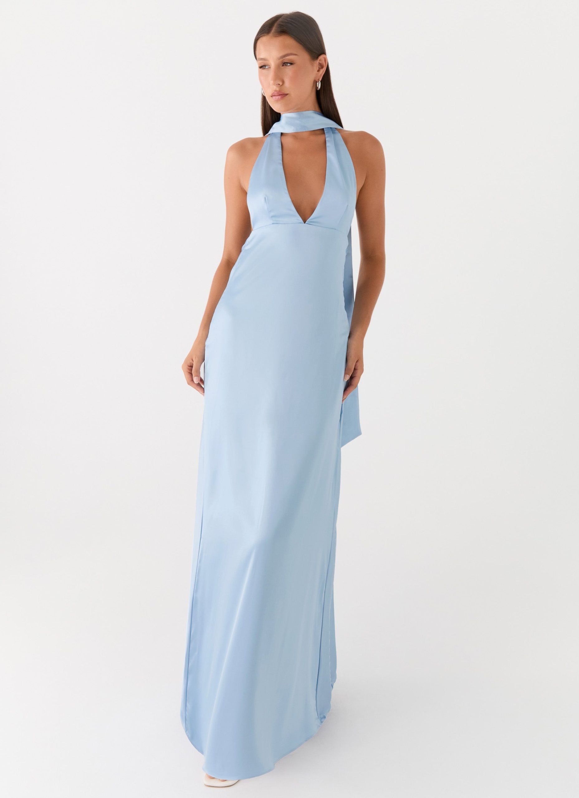 The Alicia Satin Halter Maxi Dress glides through balmy nights with its low V neckline and flowing maxi length. Featuring a statement thick neck scarf and thin adjustable straps. it frames a sultry low cowl back designed for maximum impact. Crafted from smooth satin and fully lined. this silhouette is a standout for sunset to sundown soirées.