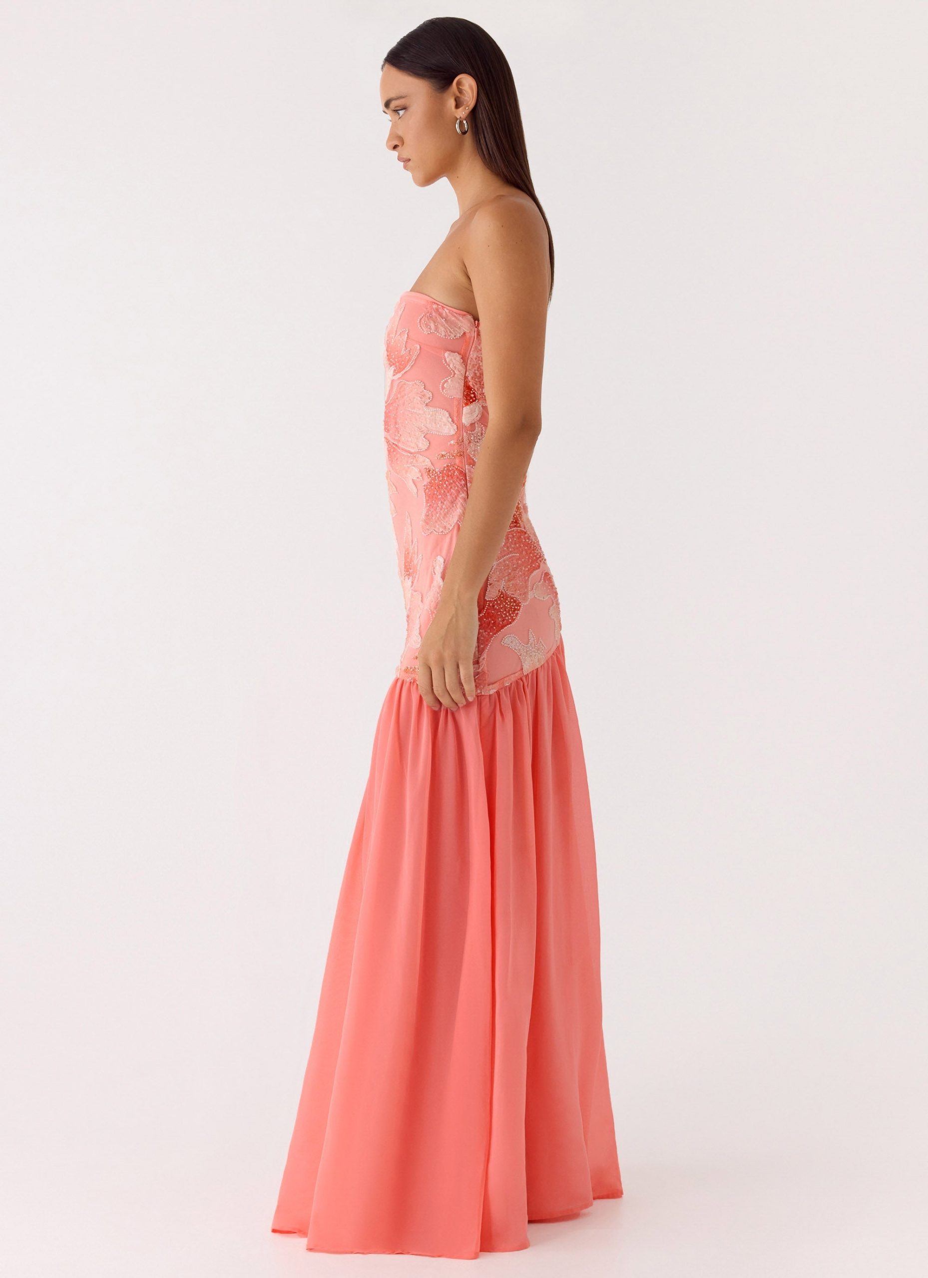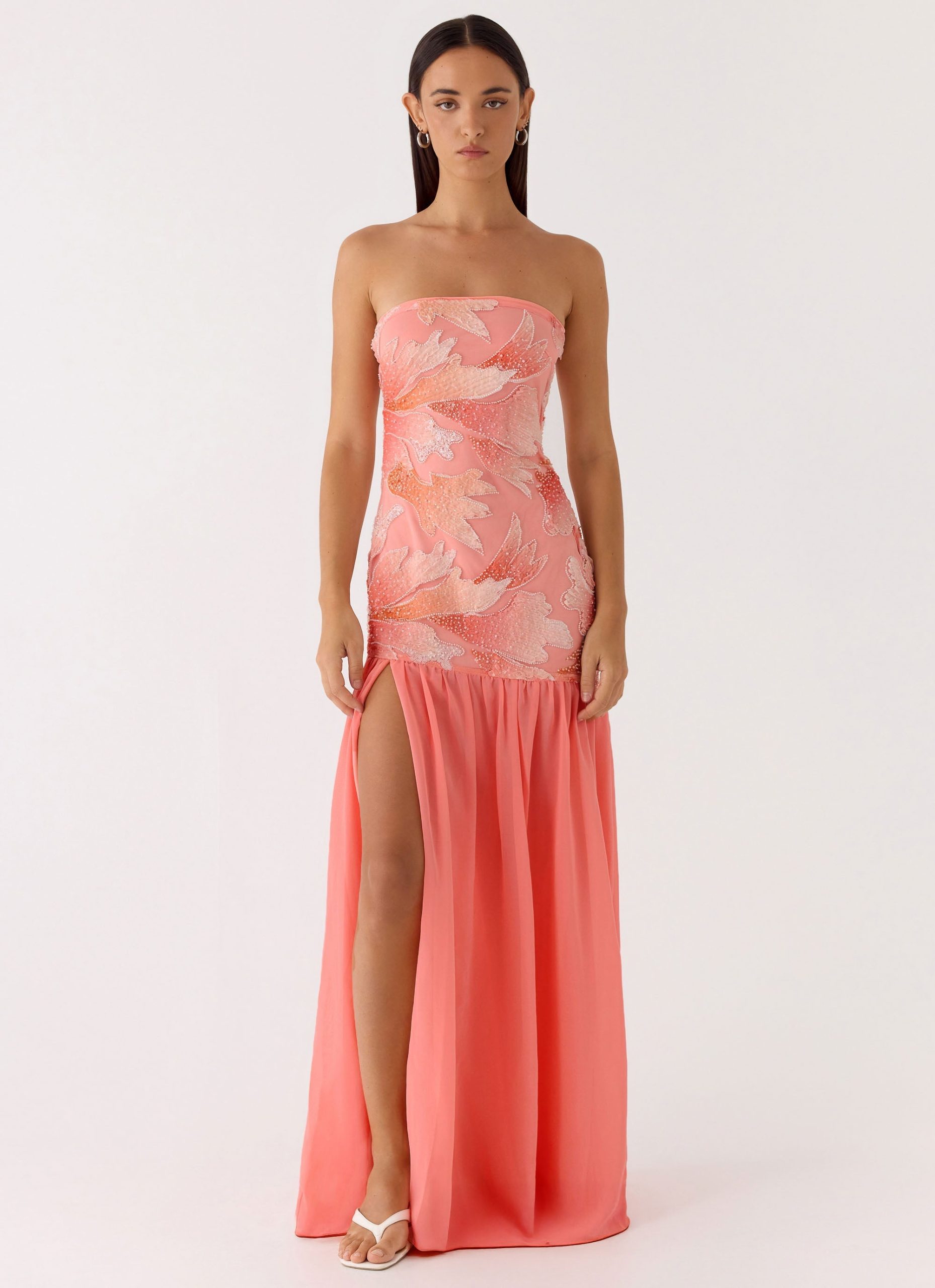 The Allana Beaded Maxi Dress features a strapless neckline and a beaded bodice. this maxi silhouette falls into a chiffon skirt with a dramatic drop waist seam. Fully lined and crafted with heavyweight fabrication. it’s long-fitting. effortlessly glamorous. and made to catch every light as you move from sunset to midnight.