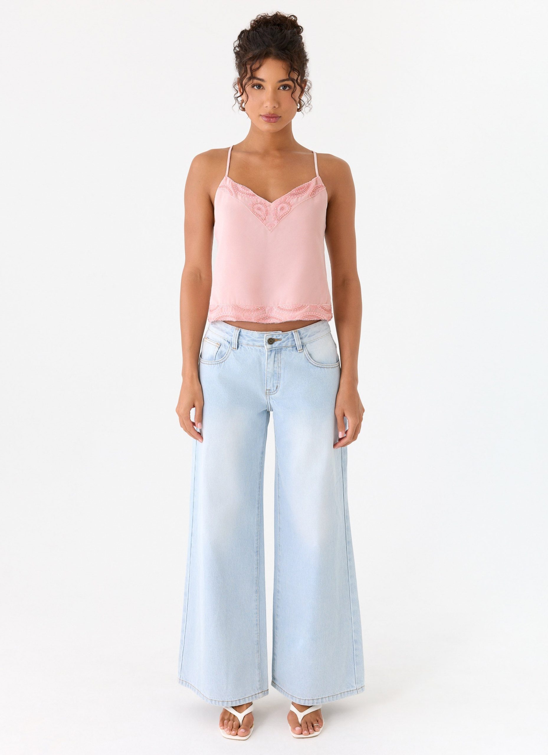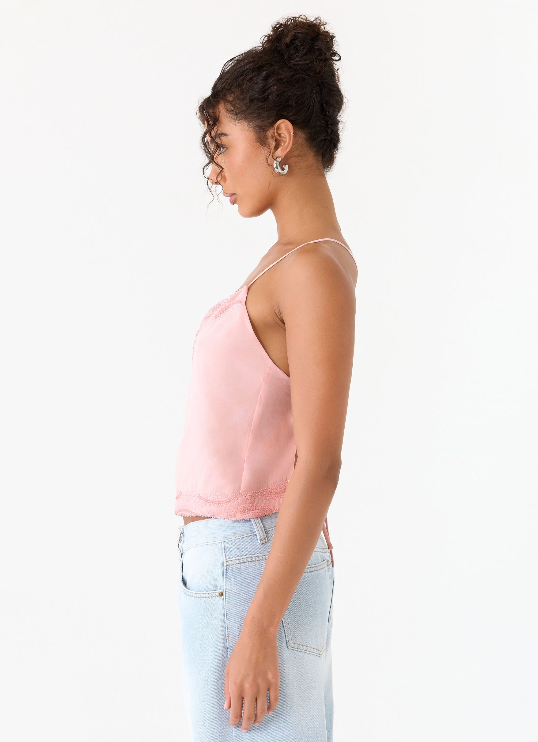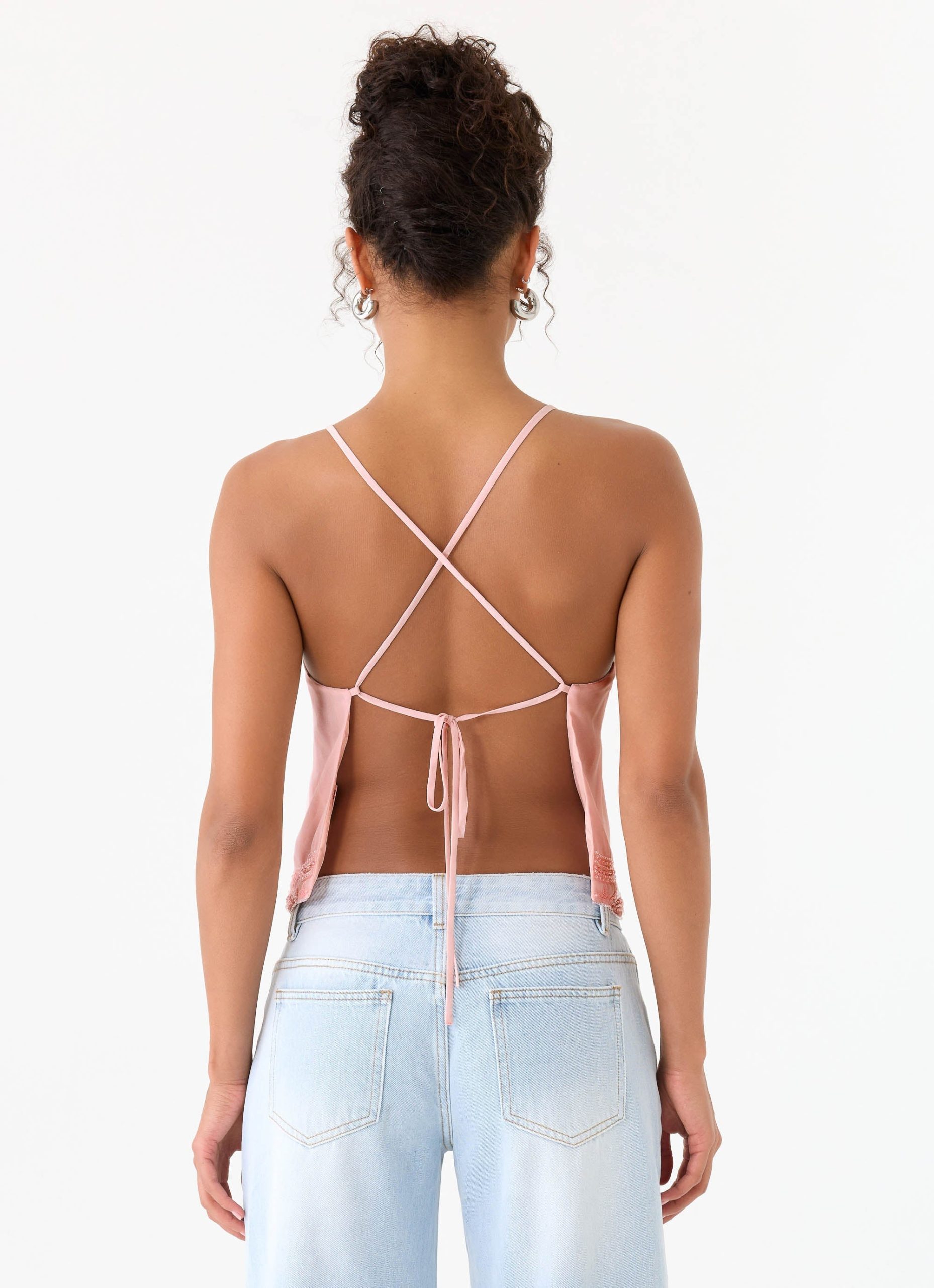 The Avania Beaded Top features custom beaded detailing along the neckline and hem. this top is crafted from a bias chiffon bodice with cross-back straps and an open back design. Fully lined for comfort. it moves with confidence from golden hour into after-dark moments.