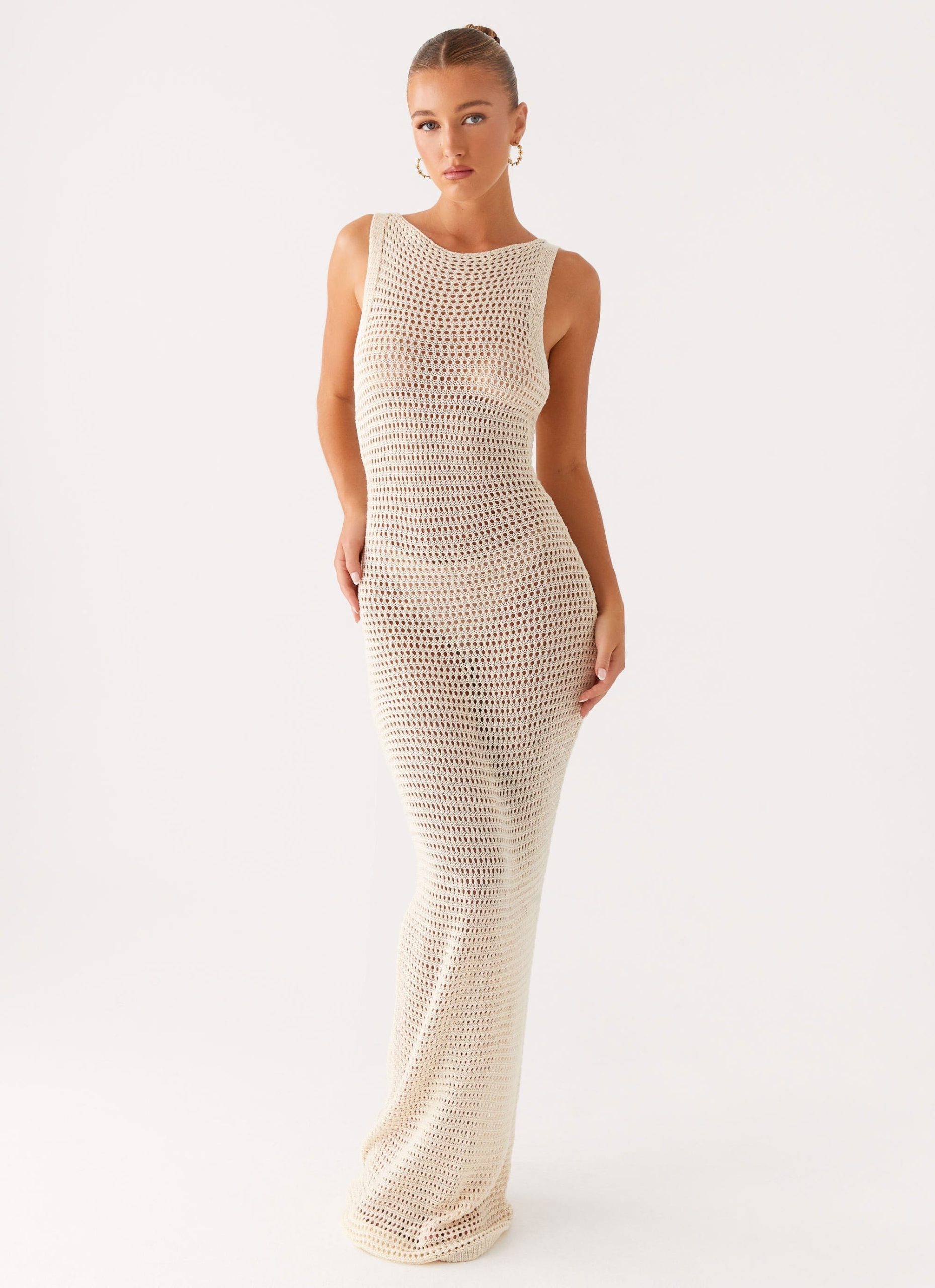 Beach House Crochet Maxi Dress: The Beach House Crochet Maxi Dress combines effortless boho vibes with a sheer crochet material and wide neckline. creating an open-back design that’s perfect for beachside escapes or casual summer events.