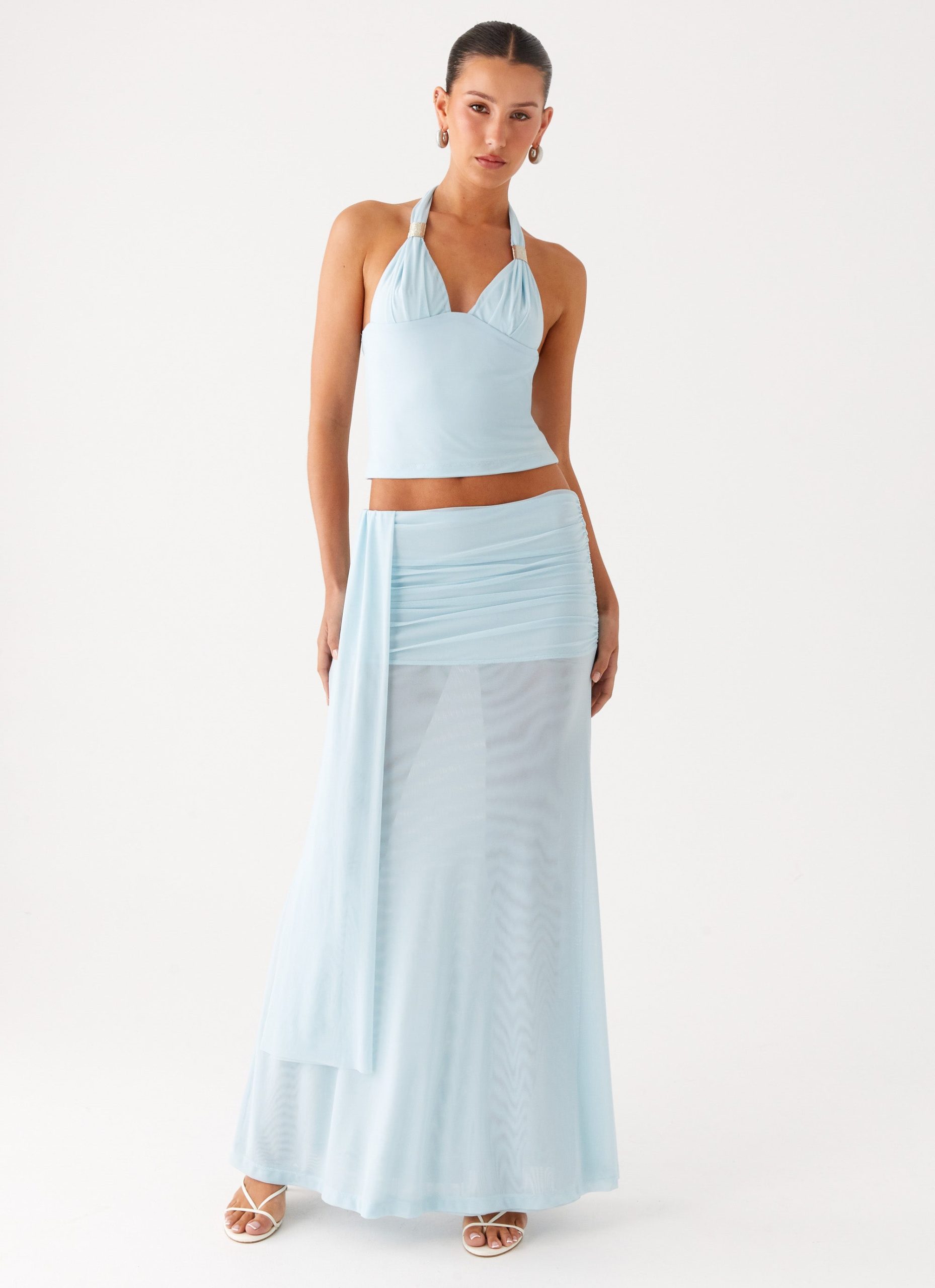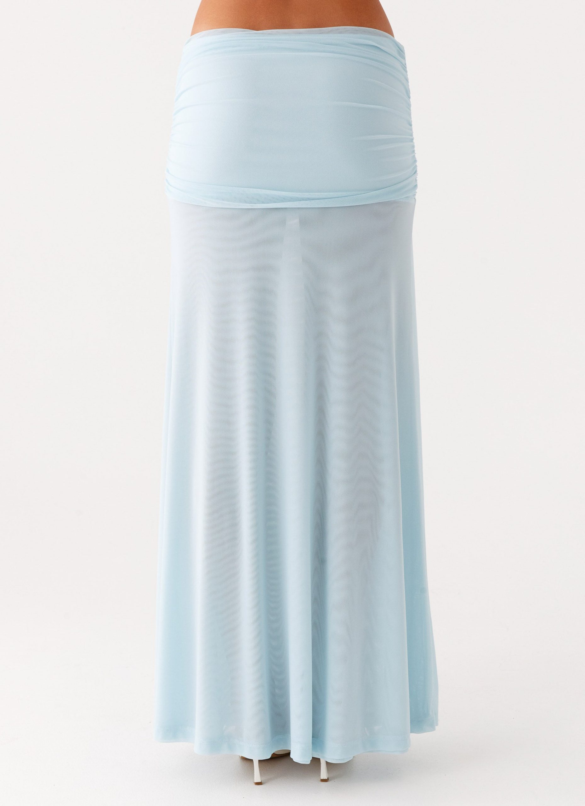 The Blaze Maxi Skirt is made for bold nights and vibrant energy. Featuring a low rise with ruched waistband and side sash. this fully lined stretch mesh maxi skirt offers a flattering silhouette in a baby blue hue.