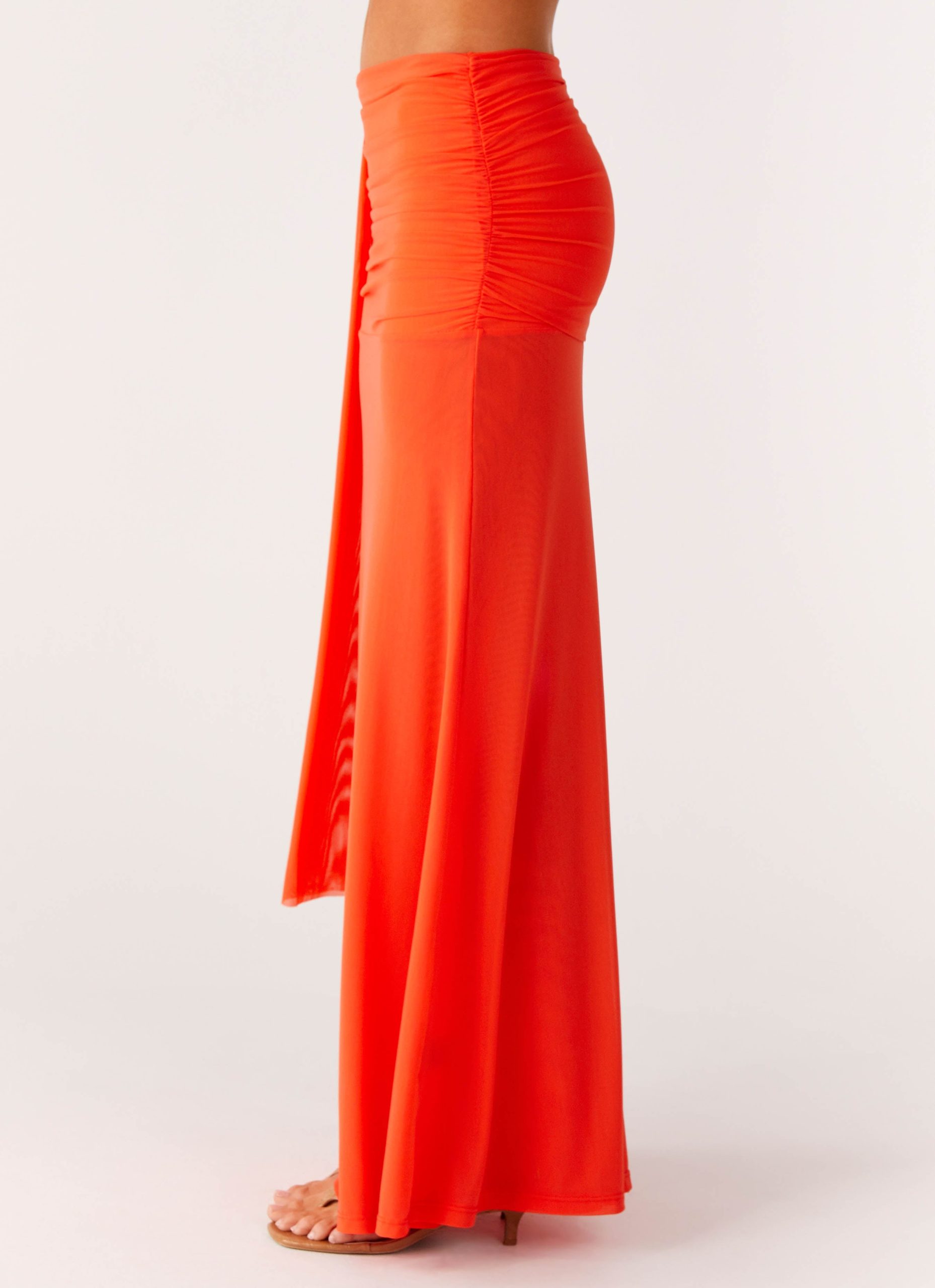 The Blaze Maxi Skirt is made for bold nights and vibrant energy. Featuring a low rise with ruched waistband and side sash. this fully lined stretch mesh maxi skirt offers a flattering silhouette in a fiery red hue.