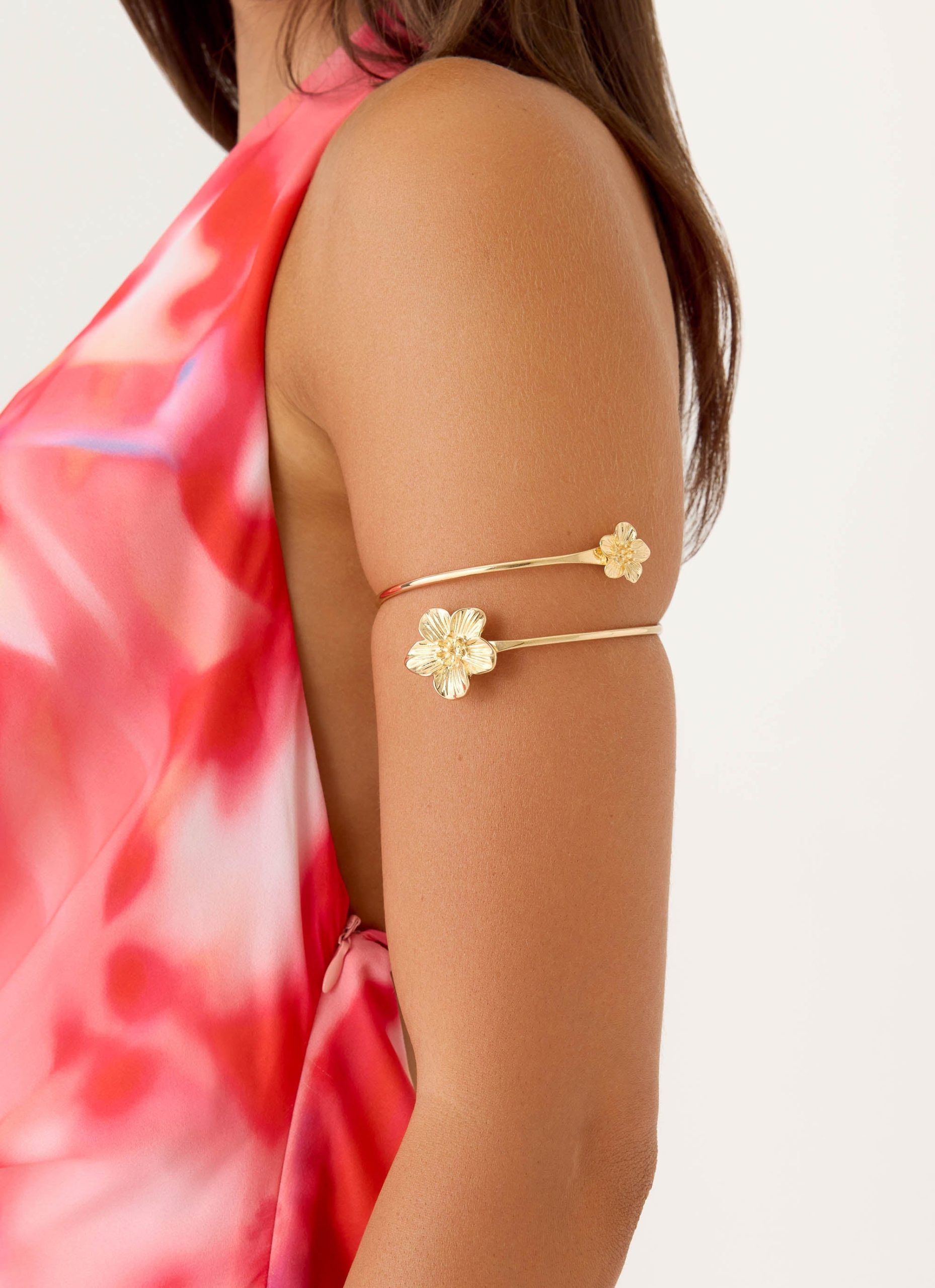 The Blooming Love Arm Cuff is designed to add a sculptural finish to your evening look. Featuring a statement arm silhouette with delicate flower detailing and an open size fit. it wraps effortlessly around the arm for a bold yet elegant touch. Perfect for sunlit events that turn into after-dark moments.