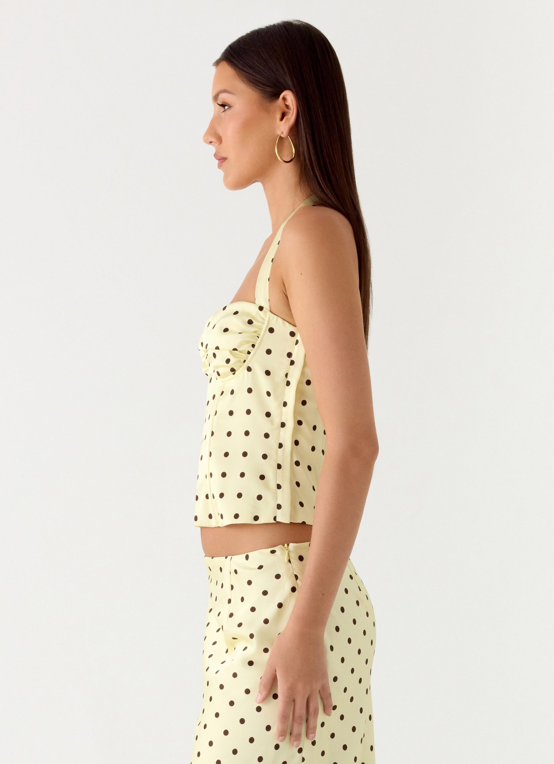 The Breanne Top is made for nights that crave flattering structure and timeless. after-dark allure. Featuring a corset-style silhouette with built-in boning and ruched underwire cups. it sculpts the figure while the halterneck design adds a touch of classic charm. Crafted in a buttery fabric with an exclusive polka dot print. it’s the perfect blend of bold elegance and golden-hour sophistication.