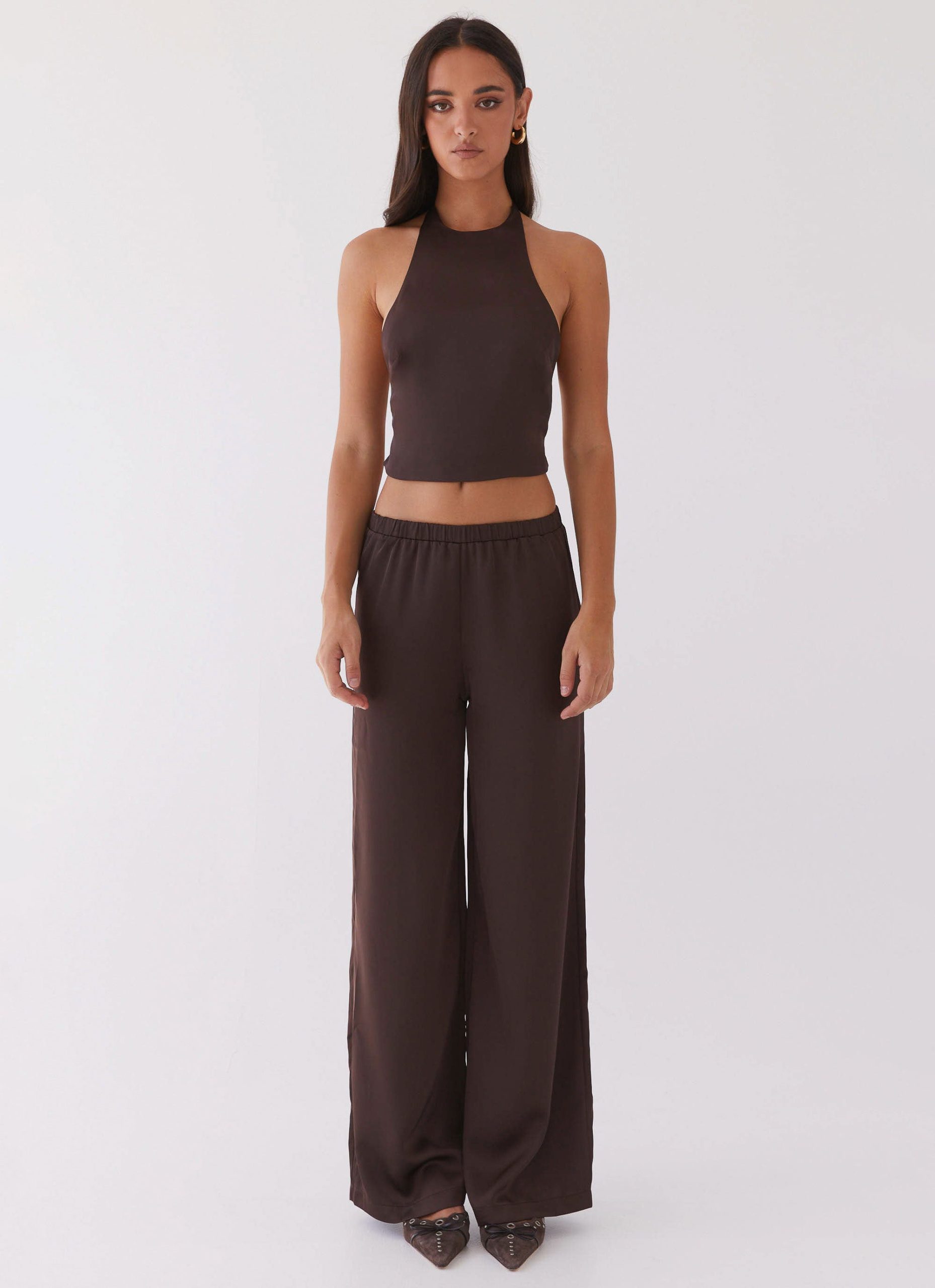 Sophisticated and classy. in the gorgeous Bree Satin Halterneck Top! She features a high neckline. silky soft satin fabric and an open back with adjustable closures. Pair her with the matching pants.