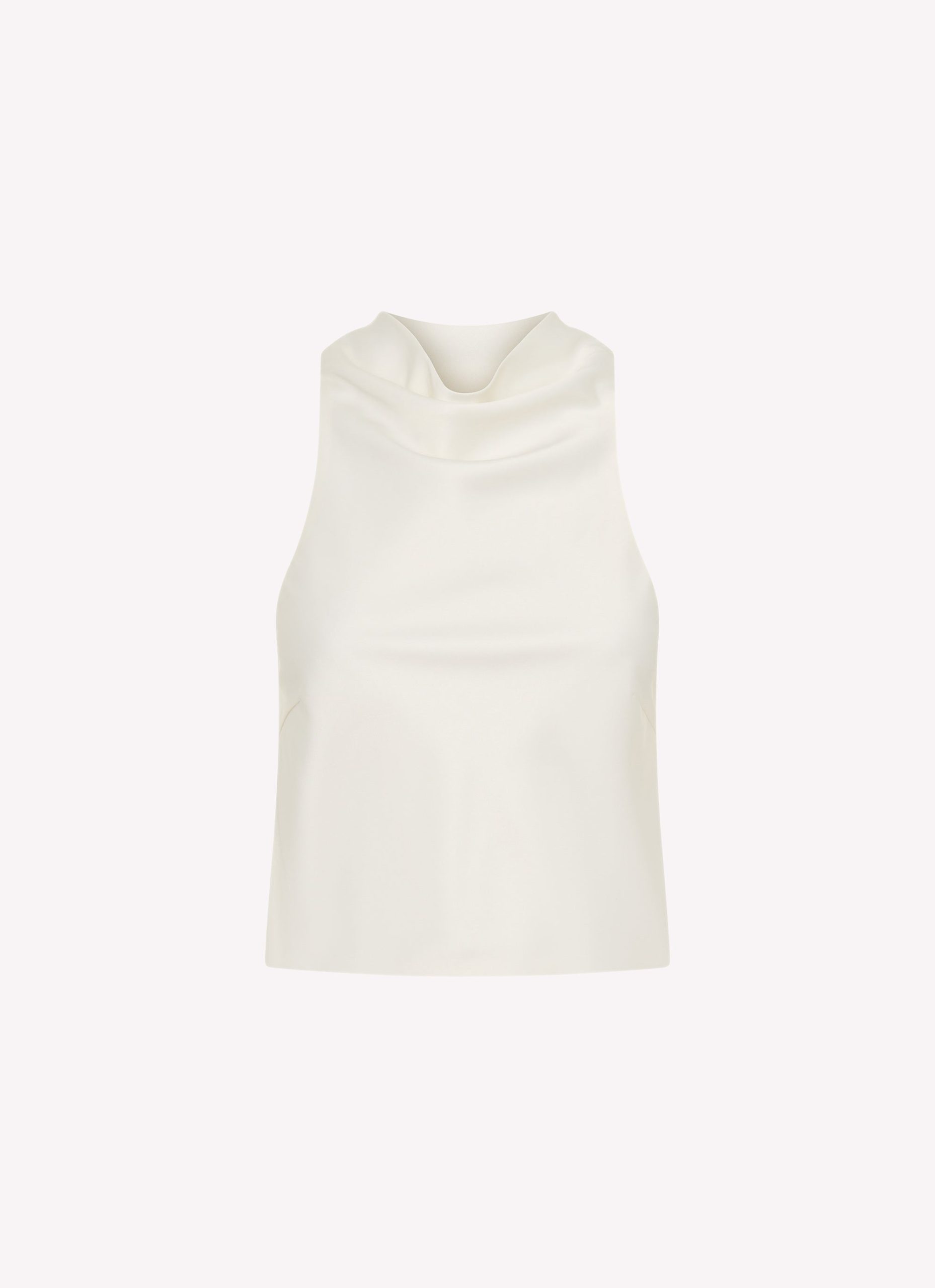 The Brookie Satin Top features a high neckline for an elegant look. with subtle side darts for a tailored fit. Its open back adds a striking contrast to the polished front design.