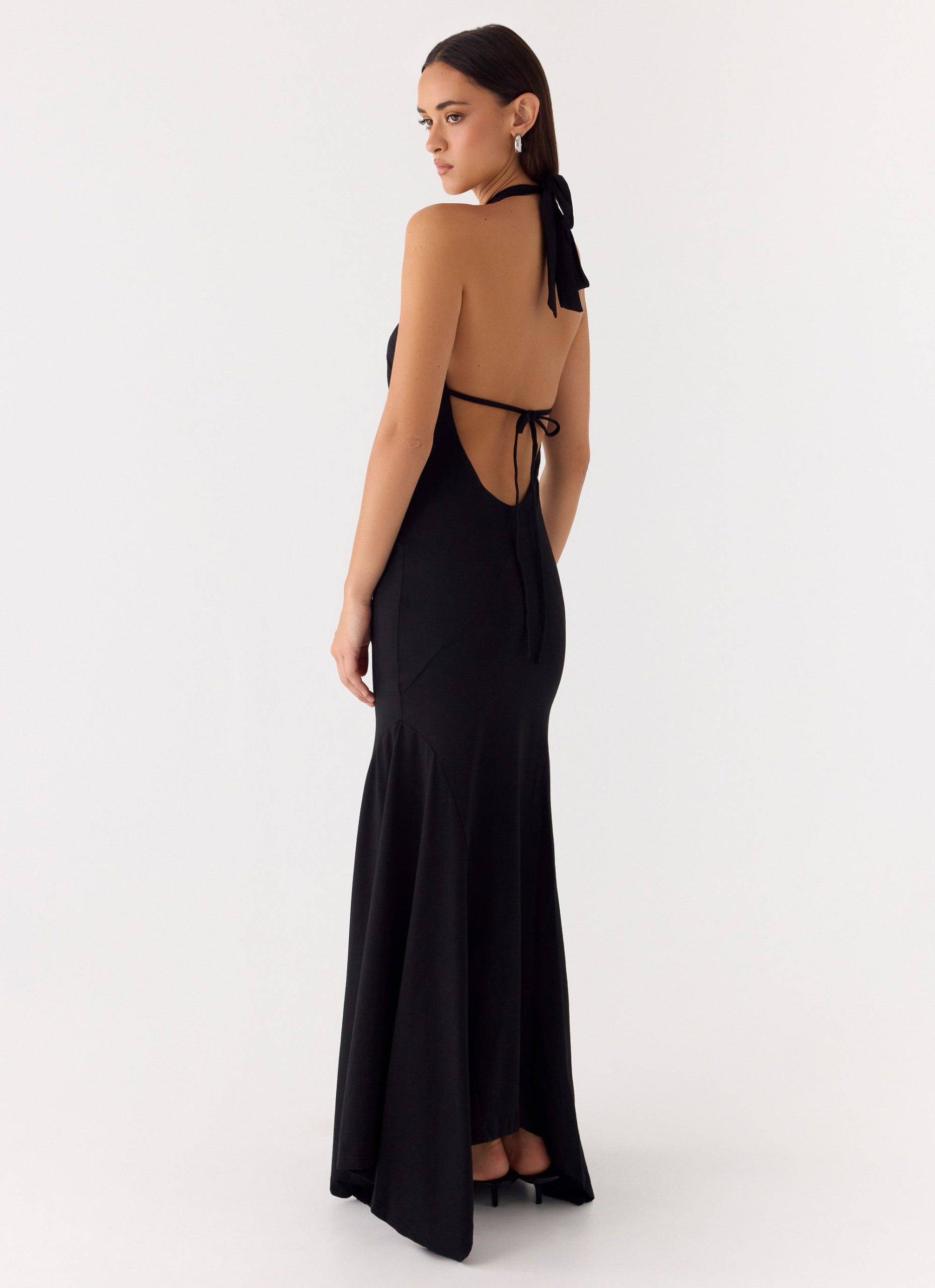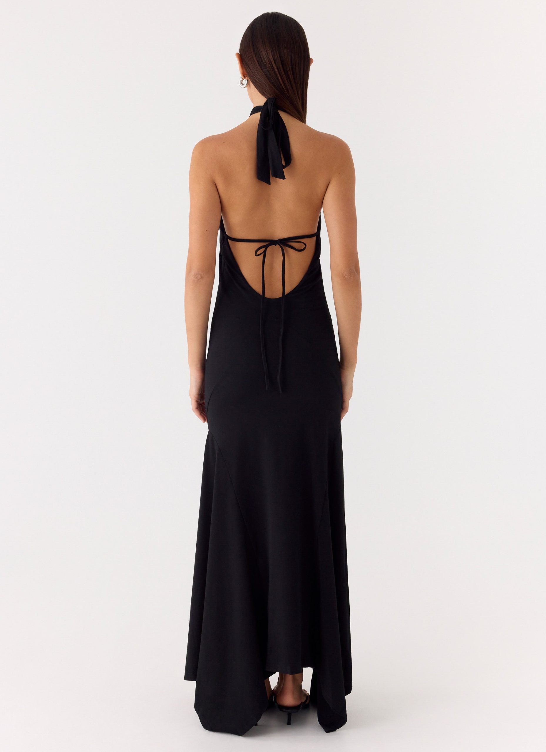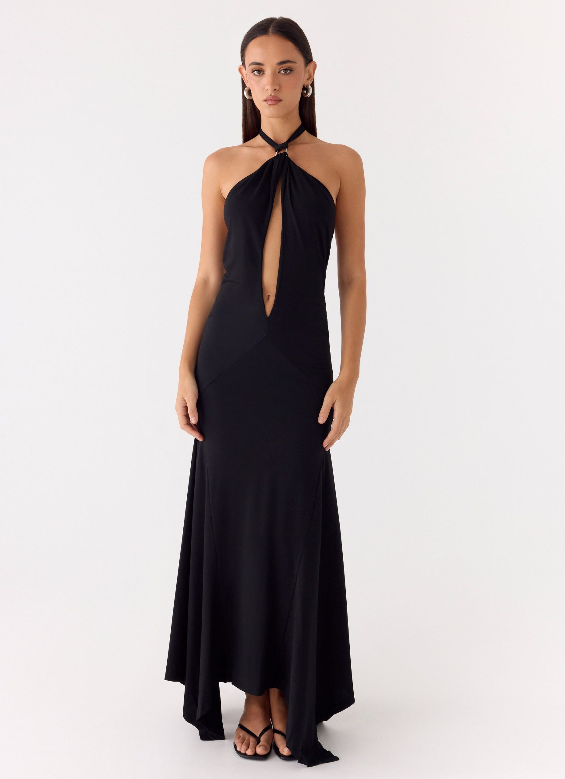 The Brynlee Maxi Dress is a sleek. statement silhouette designed with a flattering halter neckline and striking gold hardware. A front cut-out adds a bold touch. while the fully lined stretch fabric ensures a smooth. comfortable fit from day to night.