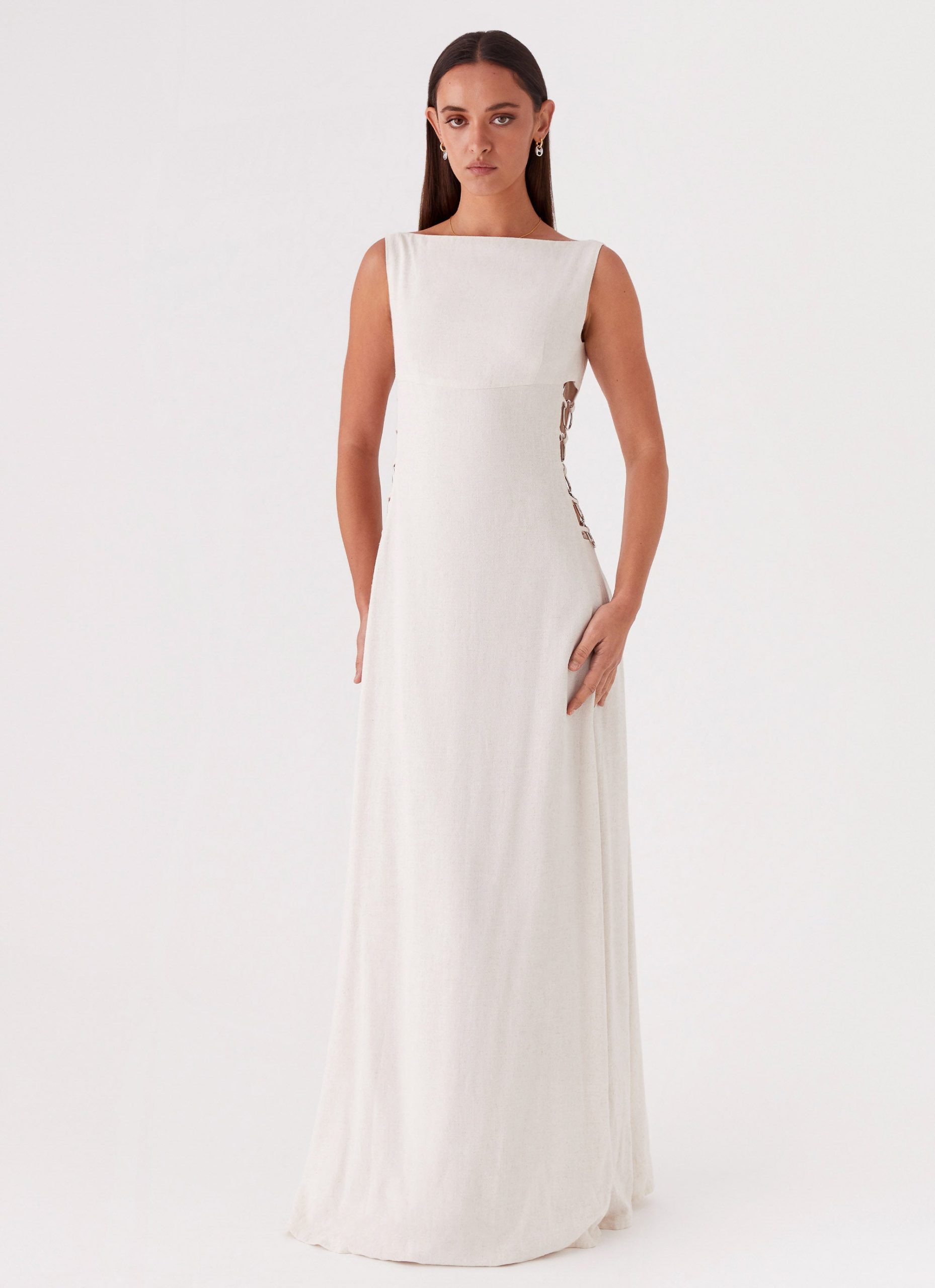 Embrace the enchantment of twilight with the Catherine Linen Maxi Dress. Featuring a high. wide neckline. this dress exudes sophistication and allure. The open back adds a touch of drama. while the cut-out sides reveal a hint of skin. adding a modern edge to its timeless silhouette.