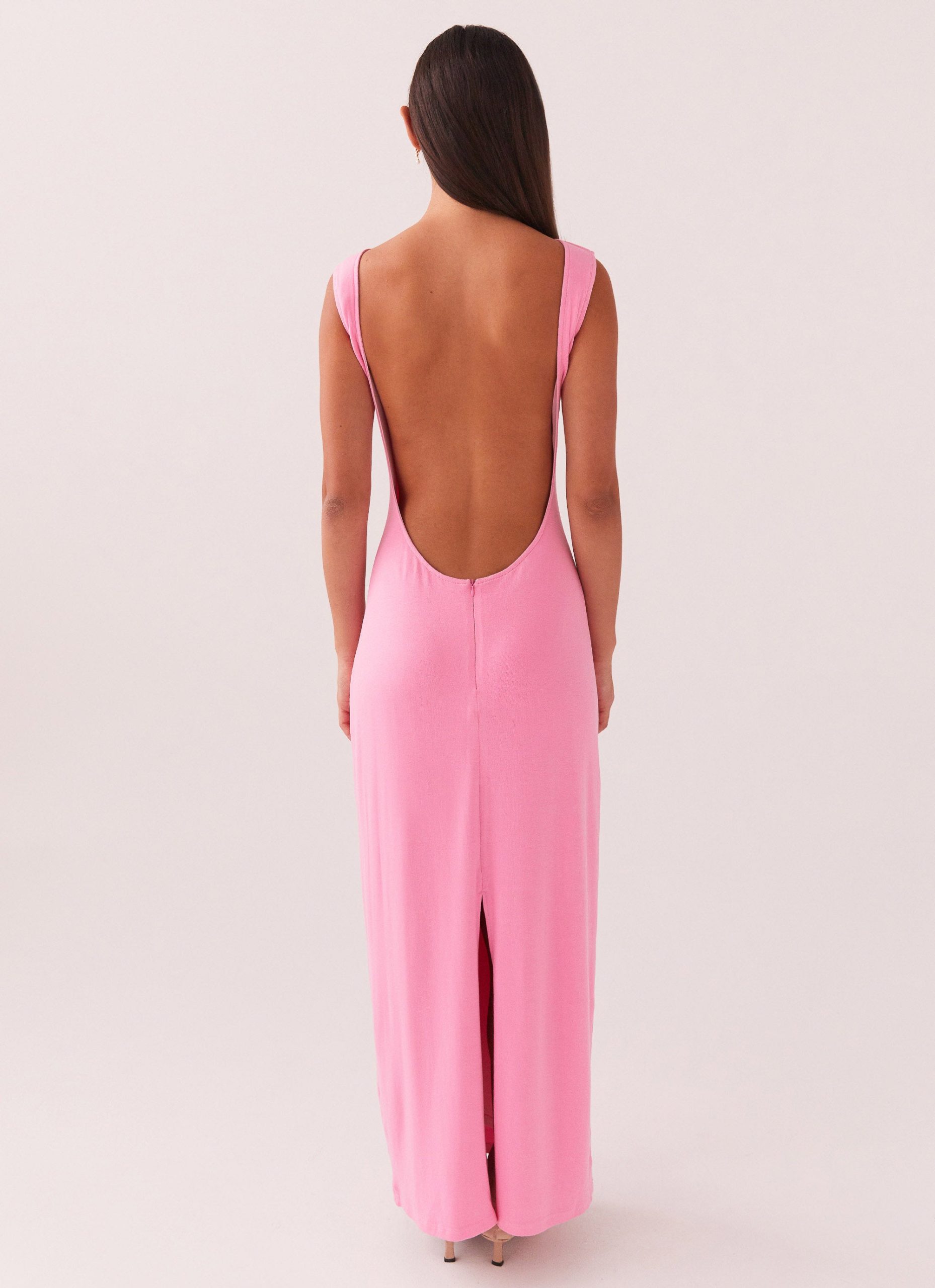 Embrace our Celina Maxi Dress. This stunning dress features an open back and high wide neck design. Available in a vibrant bright pink colorway. it’s perfect for making a statement as you embrace golden skies. balmy nights. and the captivating silhouettes of nightclub scenes.