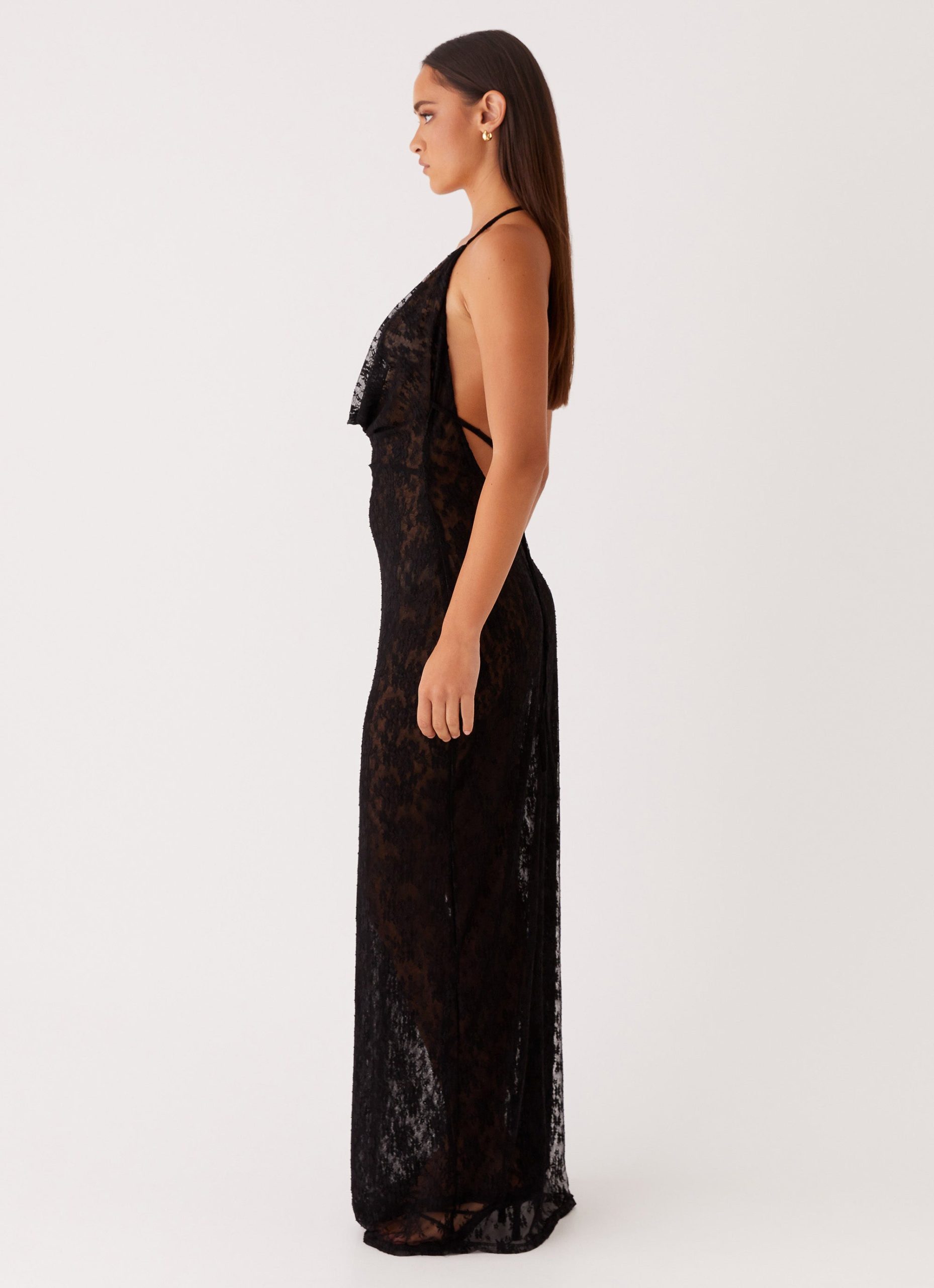 Step into the spotlight with our Champagne Coastline Maxi Dress. Featuring a deep cowl neckline and an alluring open back. this dress is crafted from a sheer lace fabric that embodies sophistication with a hint of mystery.
