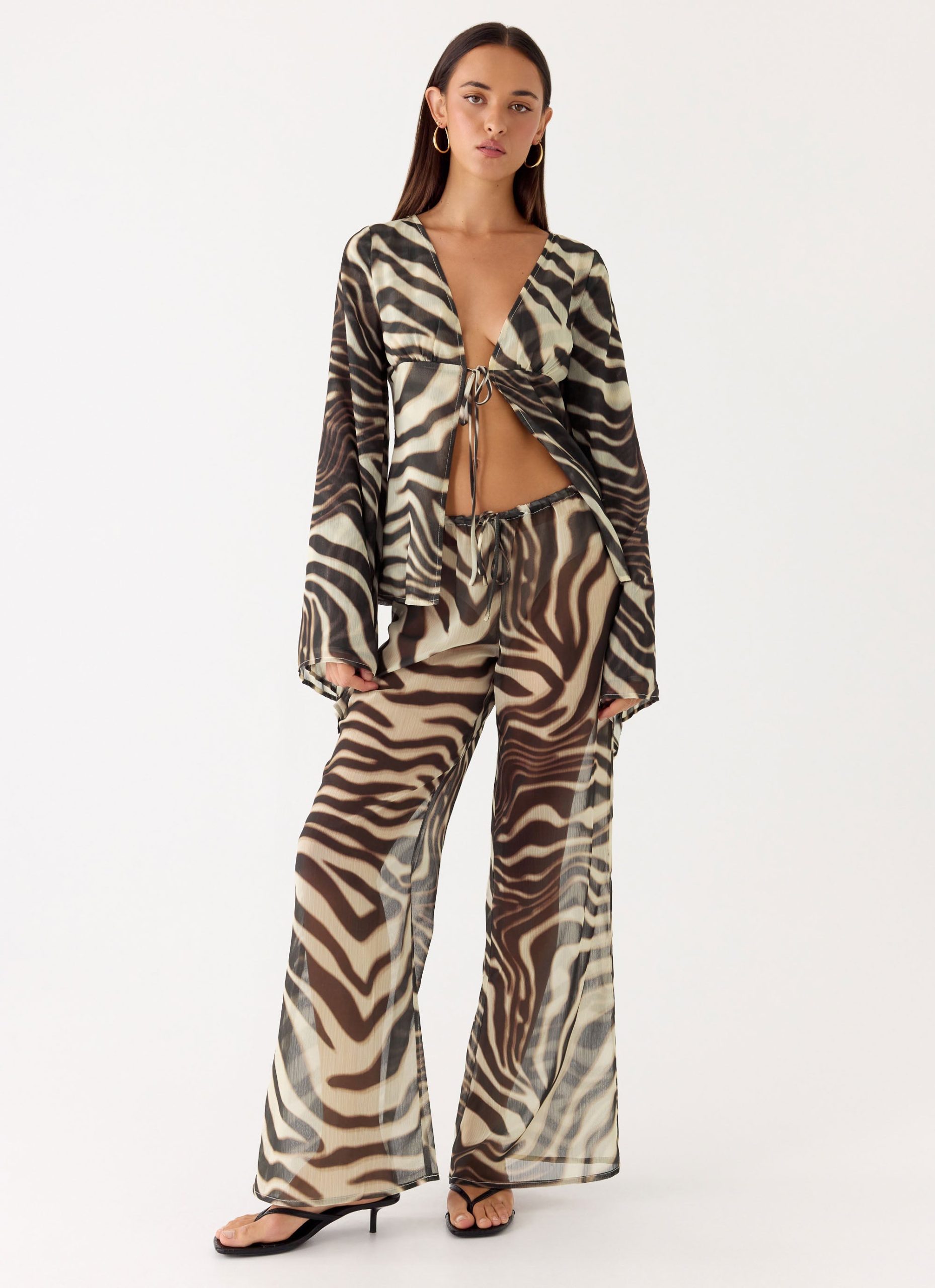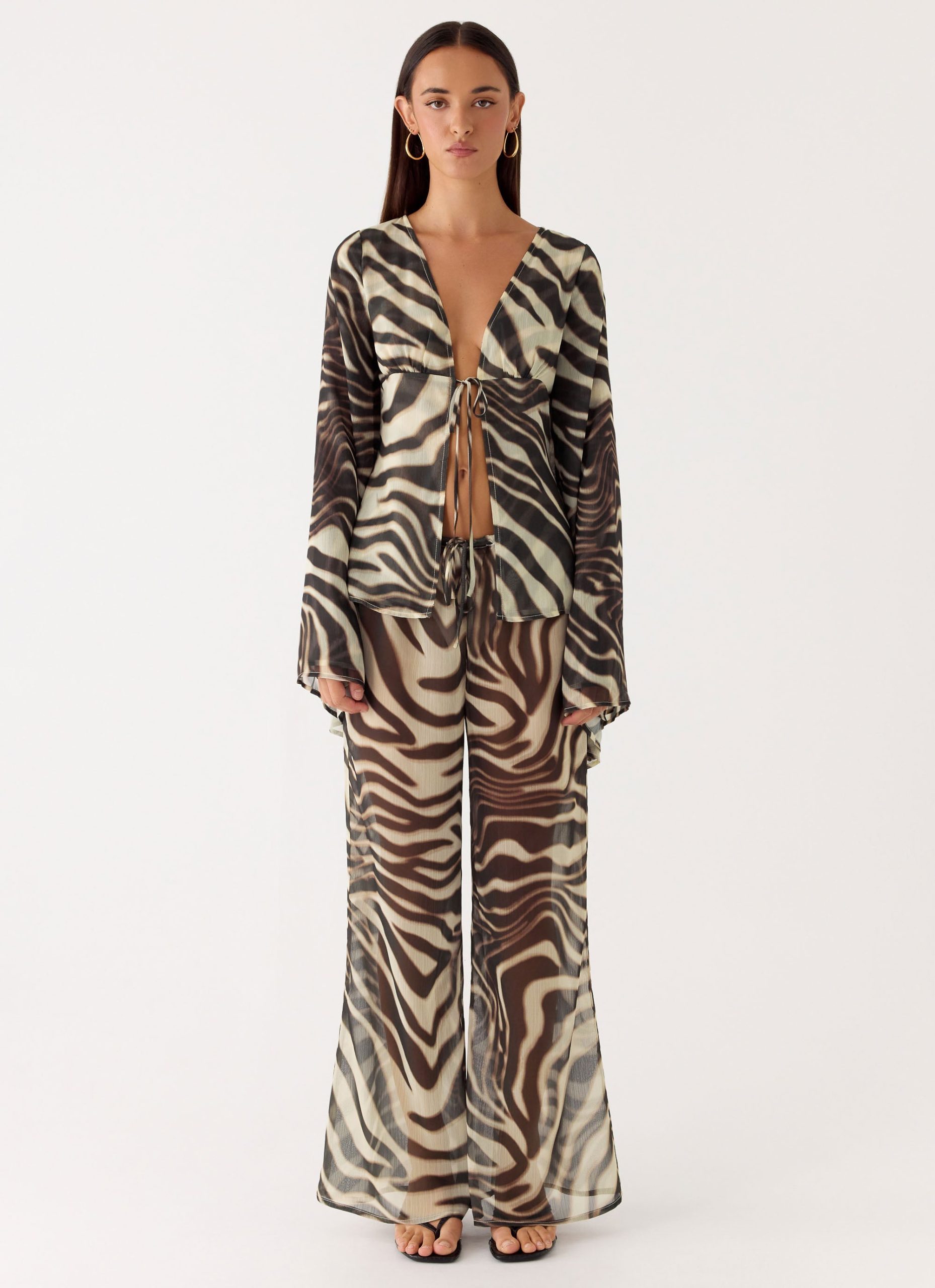 The Chaty Top is made for sunlit afternoons that transition effortlessly into evening. Featuring a deep V-neckline with under-bust gathering. it offers a flattering. fluid fit. Long flared sleeves and a tie-front detail add movement and editorial charm. finished in an exclusive print.