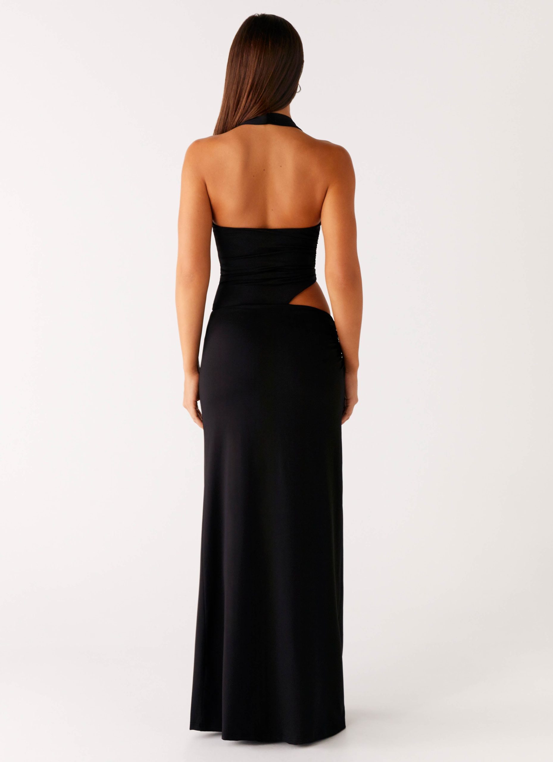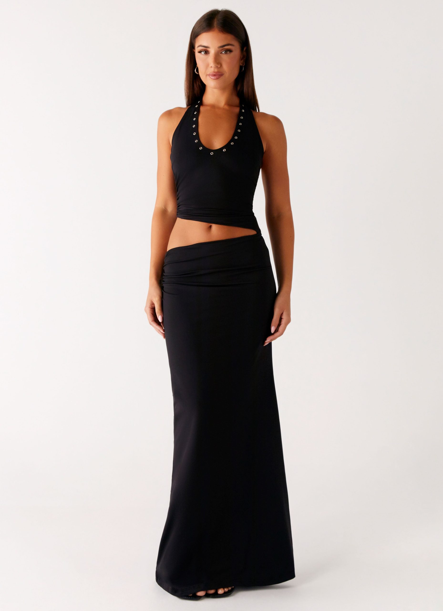The Chella Maxi Dress is made for main character moments. Featuring a halterneck line with bold eyelet detailing. side cut outs. and a sleek black silhouette. it brings just the right mix of edge and elegance for every after-dark agenda.