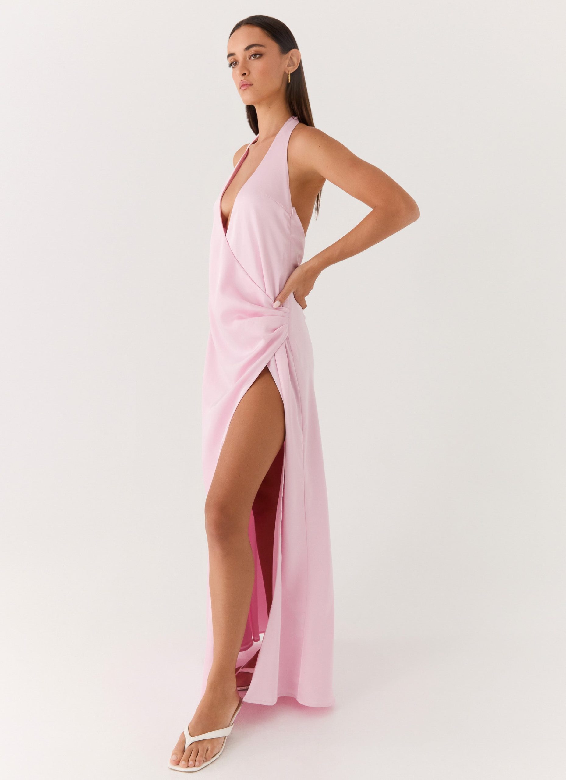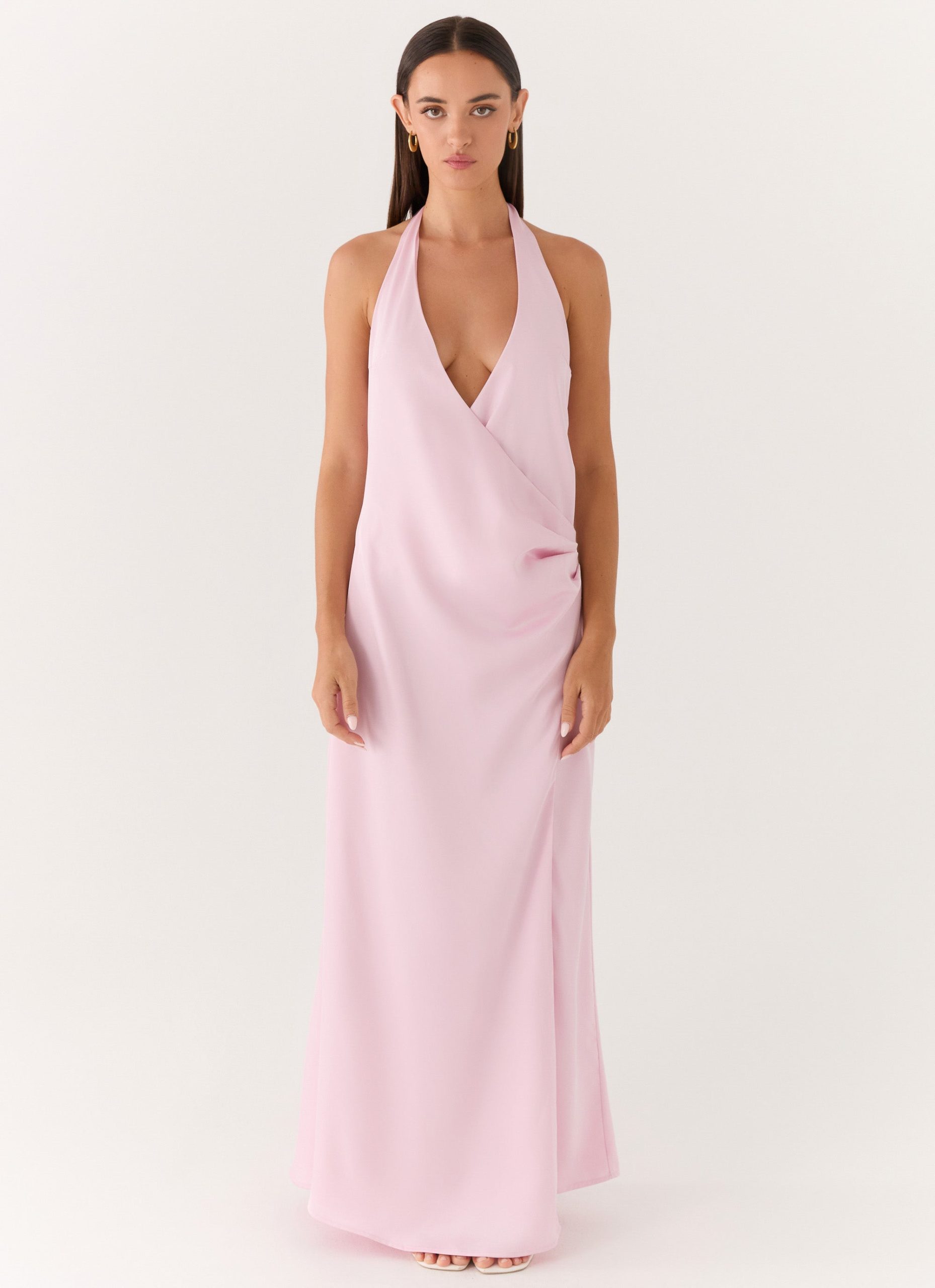 The Chellie Wrap Maxi Dress features wrap detail with a front skirt split. it drapes effortlessly over the body while a low back and long thick adjustable straps create a sculpted. editorial silhouette. Fully lined and finished with a side invisible zipper. this satin maxi-length dress moves seamlessly from sunset to after-dark soirées.