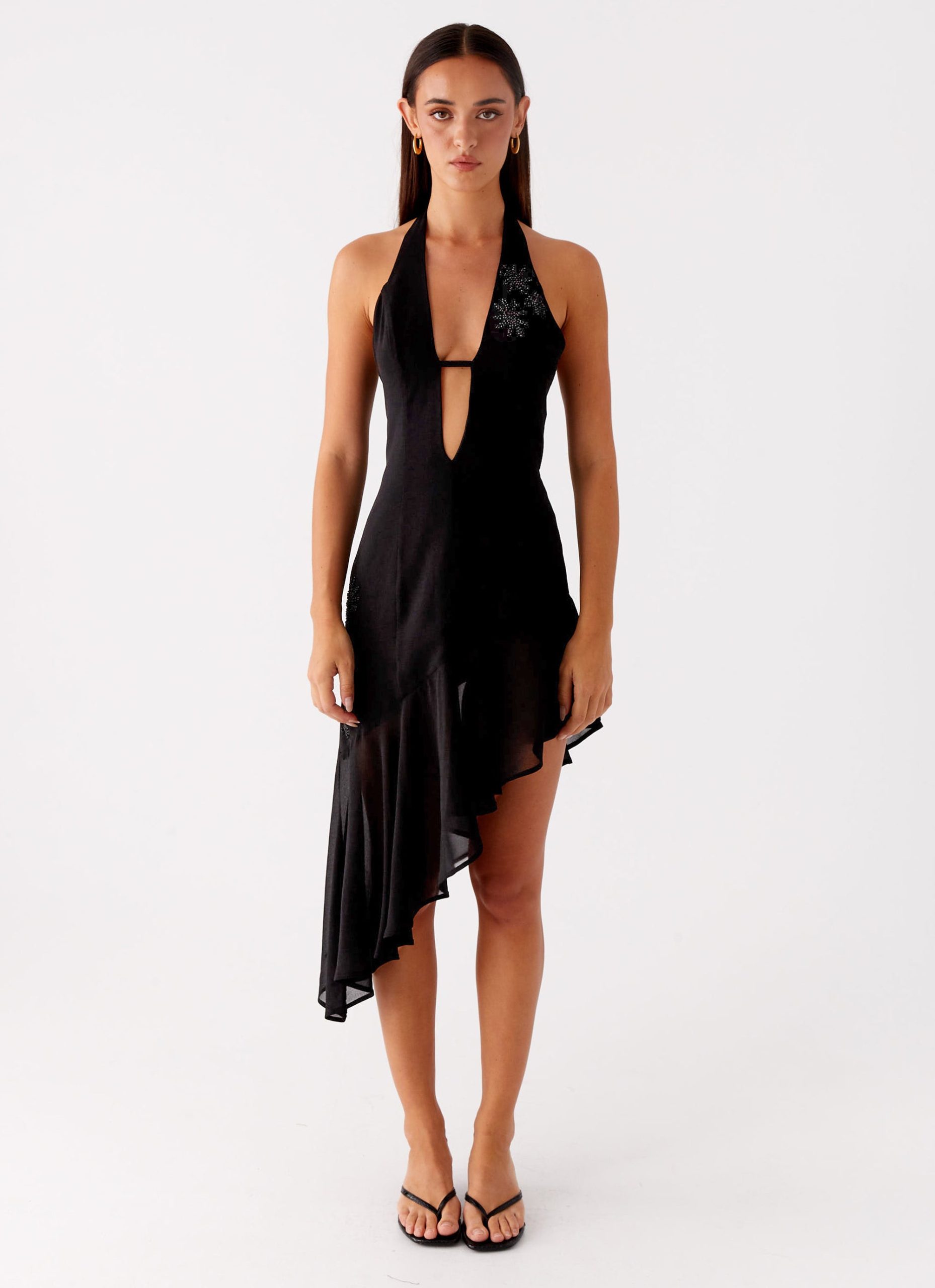 The Clean Slate Midi Dress is all drama and allure. featuring a deep V halterneck. open back. and sash neck tie. Cut from stretch material with an asymmetrical hem and full lining. it’s made to move with you from dusk to after dark.