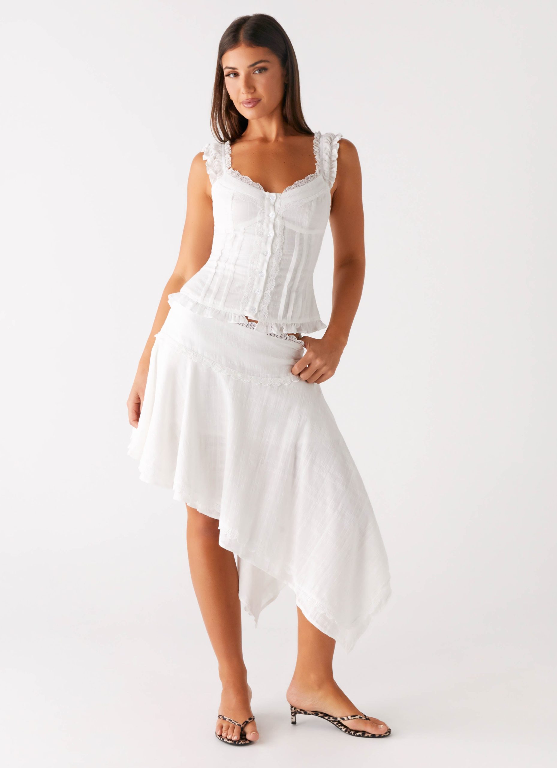 The Clearwater Mist Top is a white. mid-length top featuring a sweetheart neckline. Its clean and elegant design makes it versatile for both casual and dressier occasions.