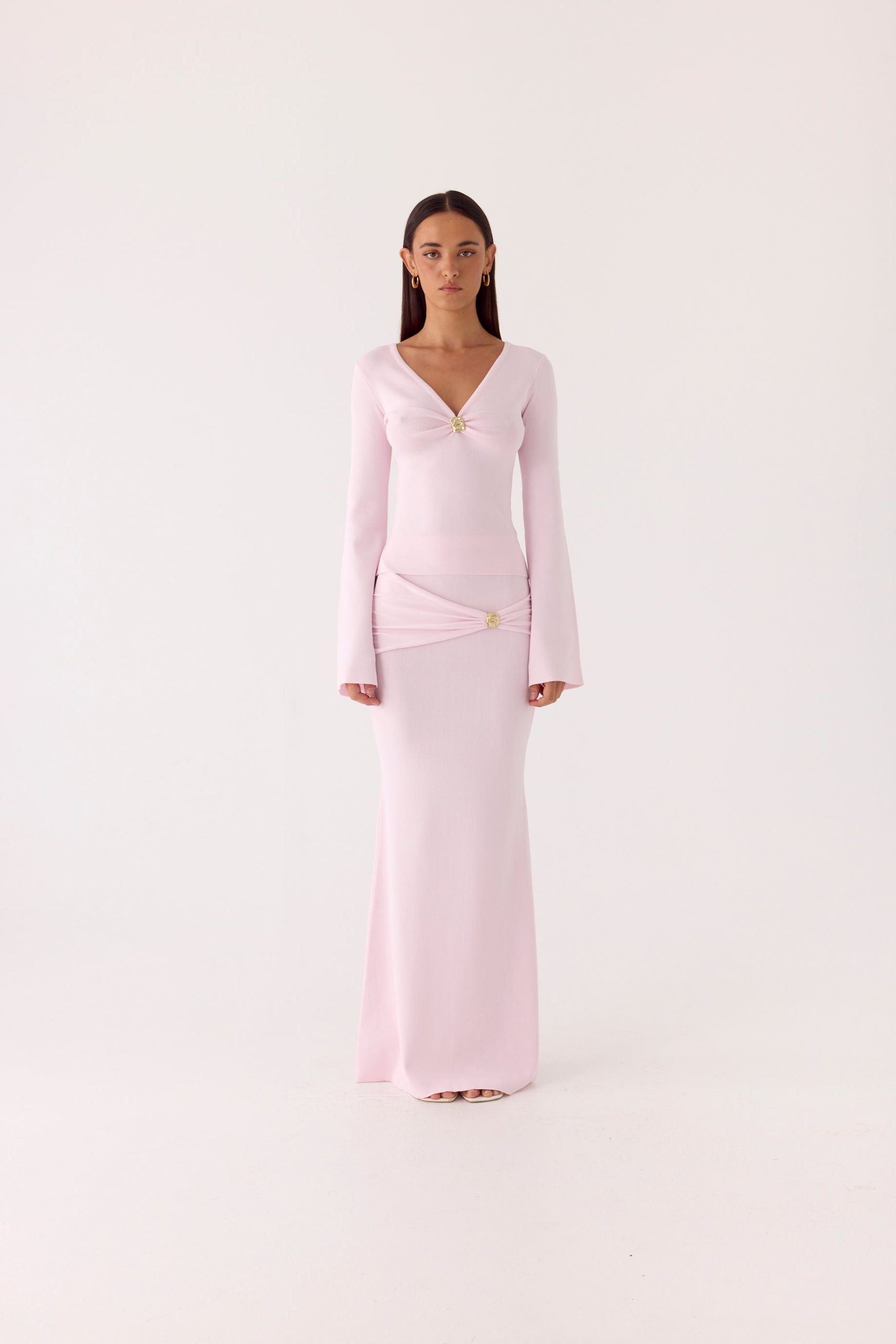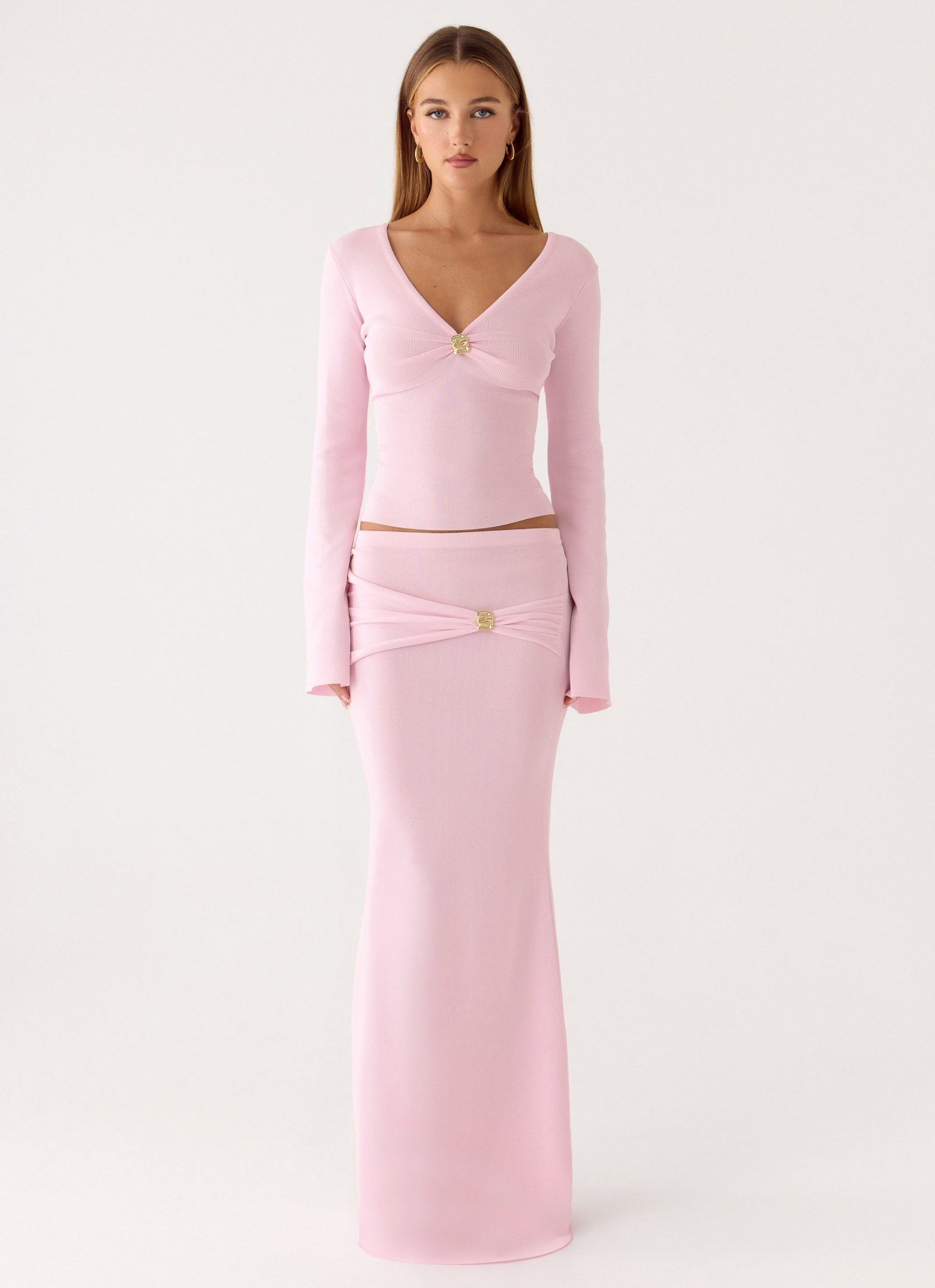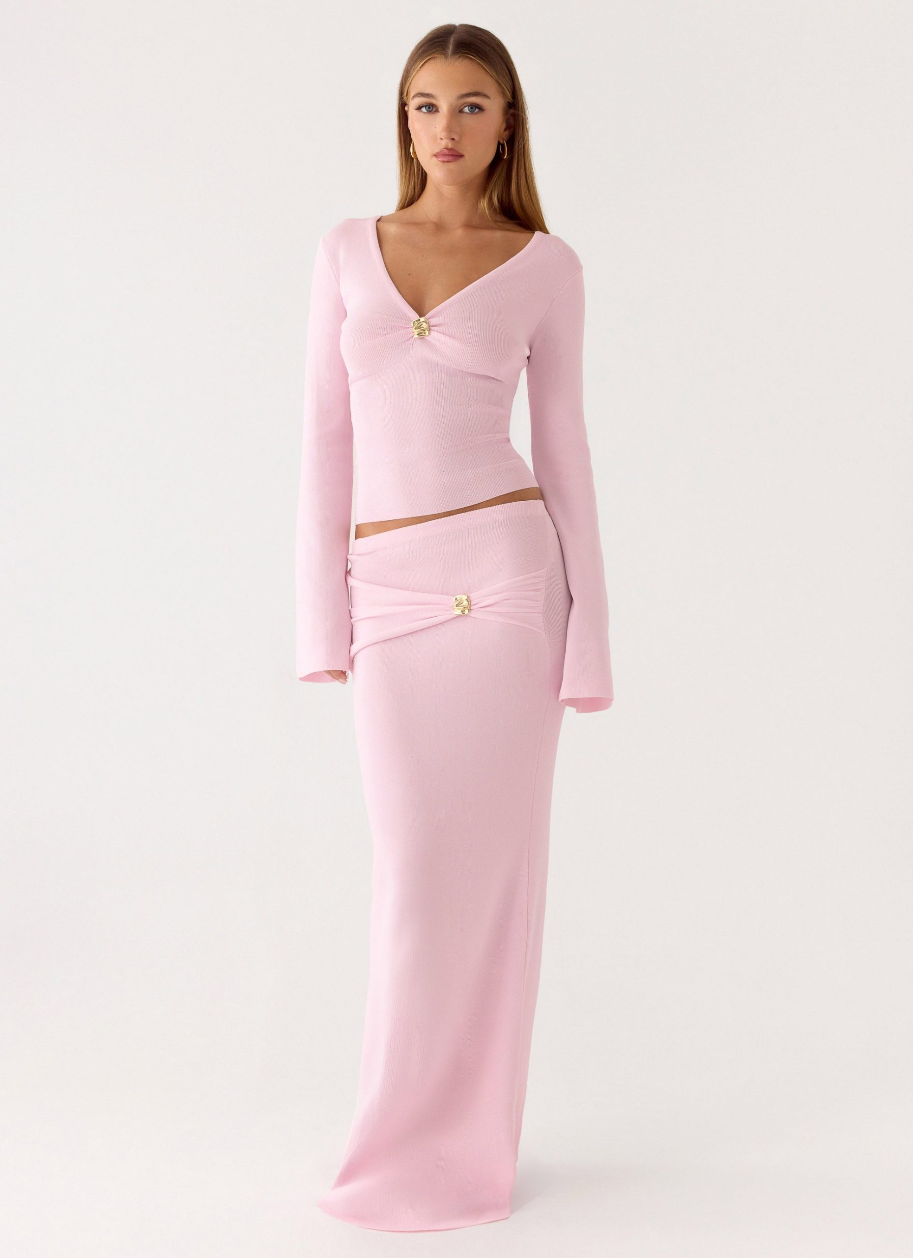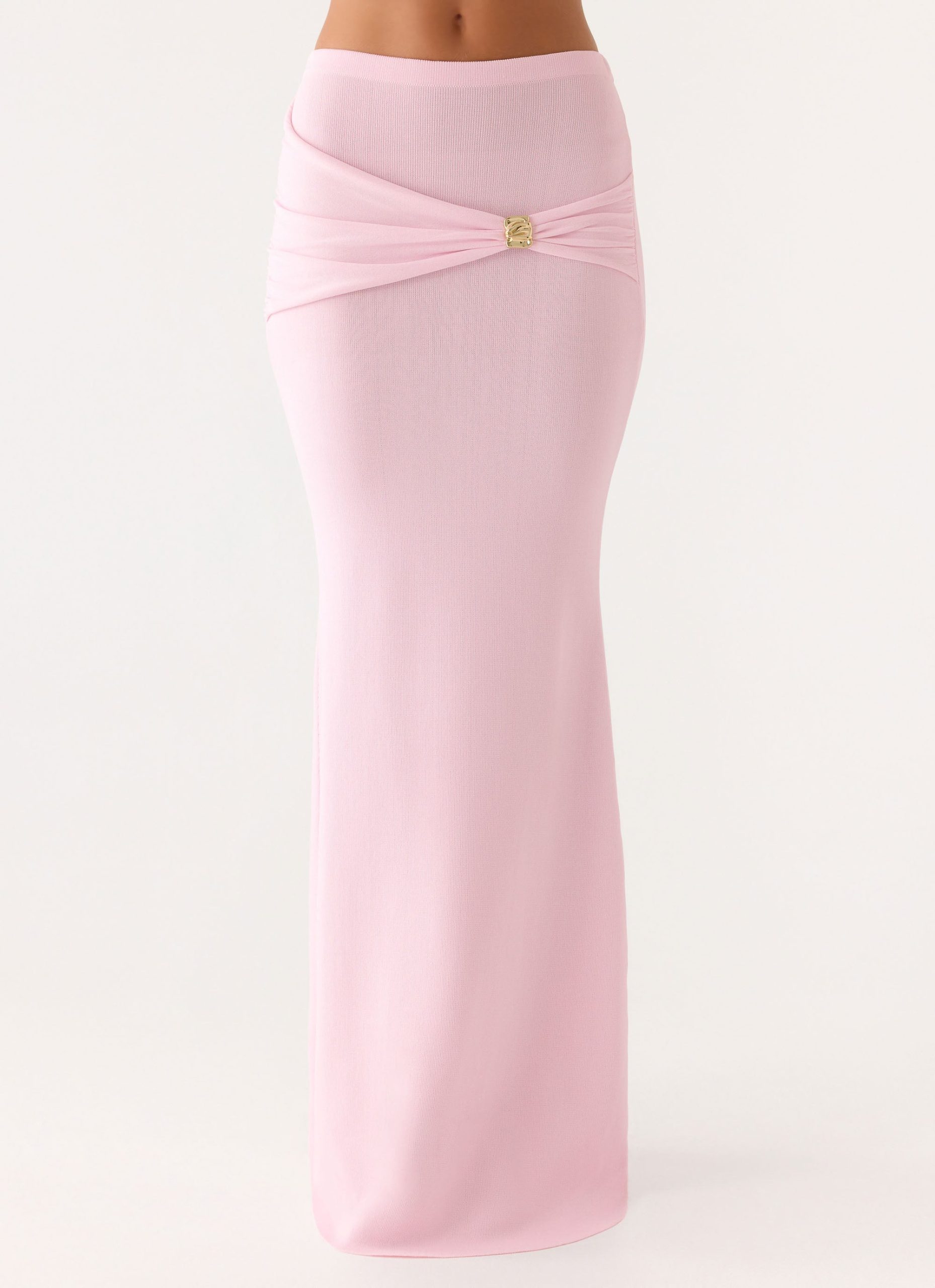 The Colipso Maxi Skirt is cut in a bodycon. low-rise silhouette. it features draped fabric with gold embellishments that catch the light. Crafted from premium stretch knit. this maxi-length skirt hugs the body while moving with confidence from golden hour into after-dark moments.