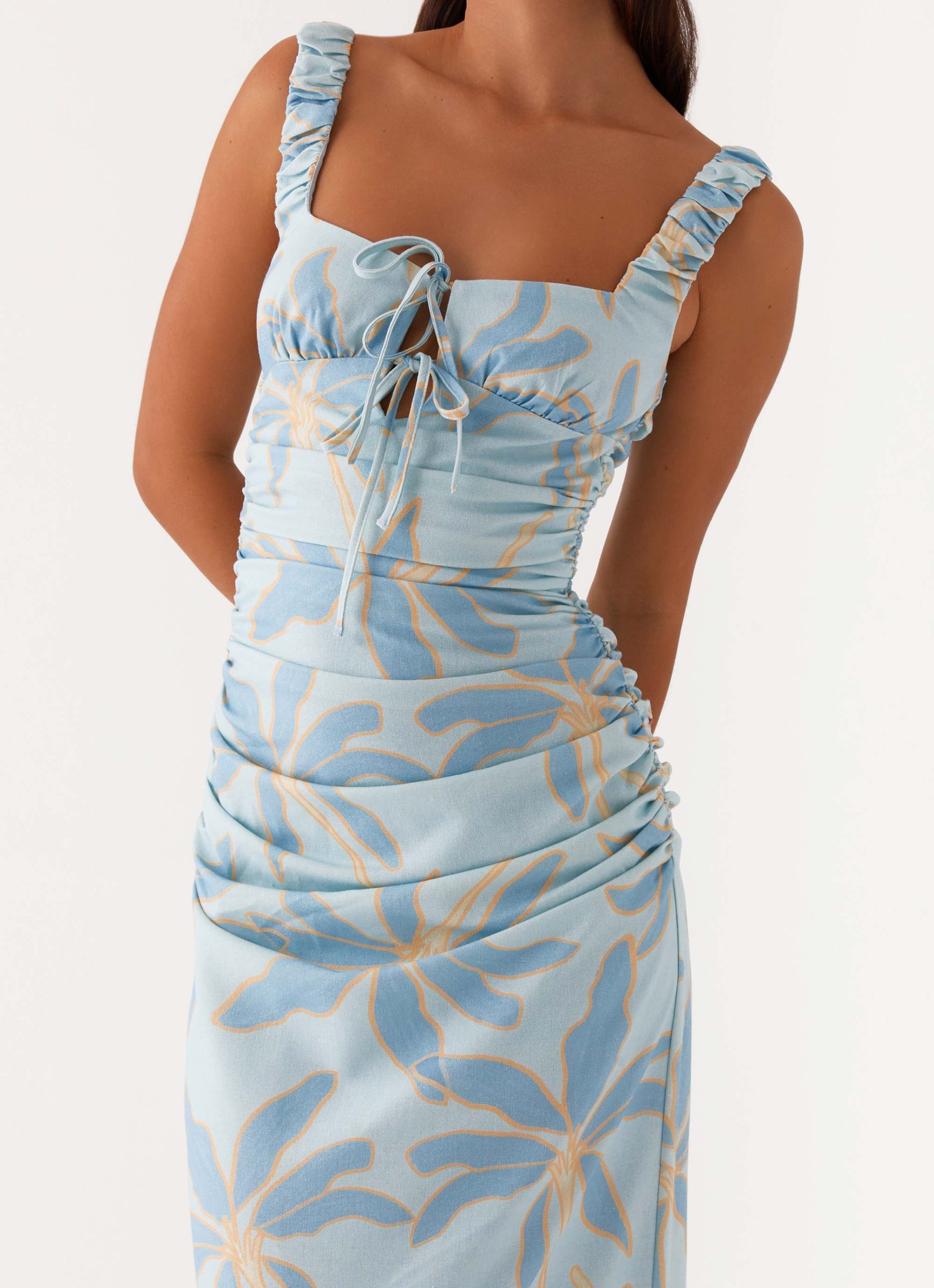 Embrace the night in the Cosmic Love Ruched Maxi Dress. Featuring a stunning square neckline and a stylish front tie. this dress flows beautifully with its ruched silhouette. With thick straps for added support. it’s your go-to for golden skies and unforgettable evenings.