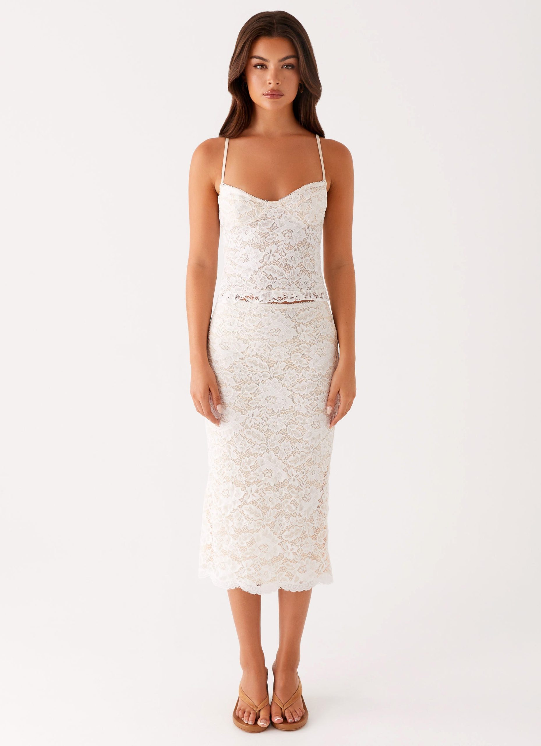 The Crystal Clear Lace Midi Skirt combines elegance and edge. featuring a low-rise waistband and a stunning lace outer layer. With its delicate lace design. this skirt creates a sophisticated. feminine silhouette that’s perfect for both day and evening wear. adding a touch of texture and allure to any outfit.