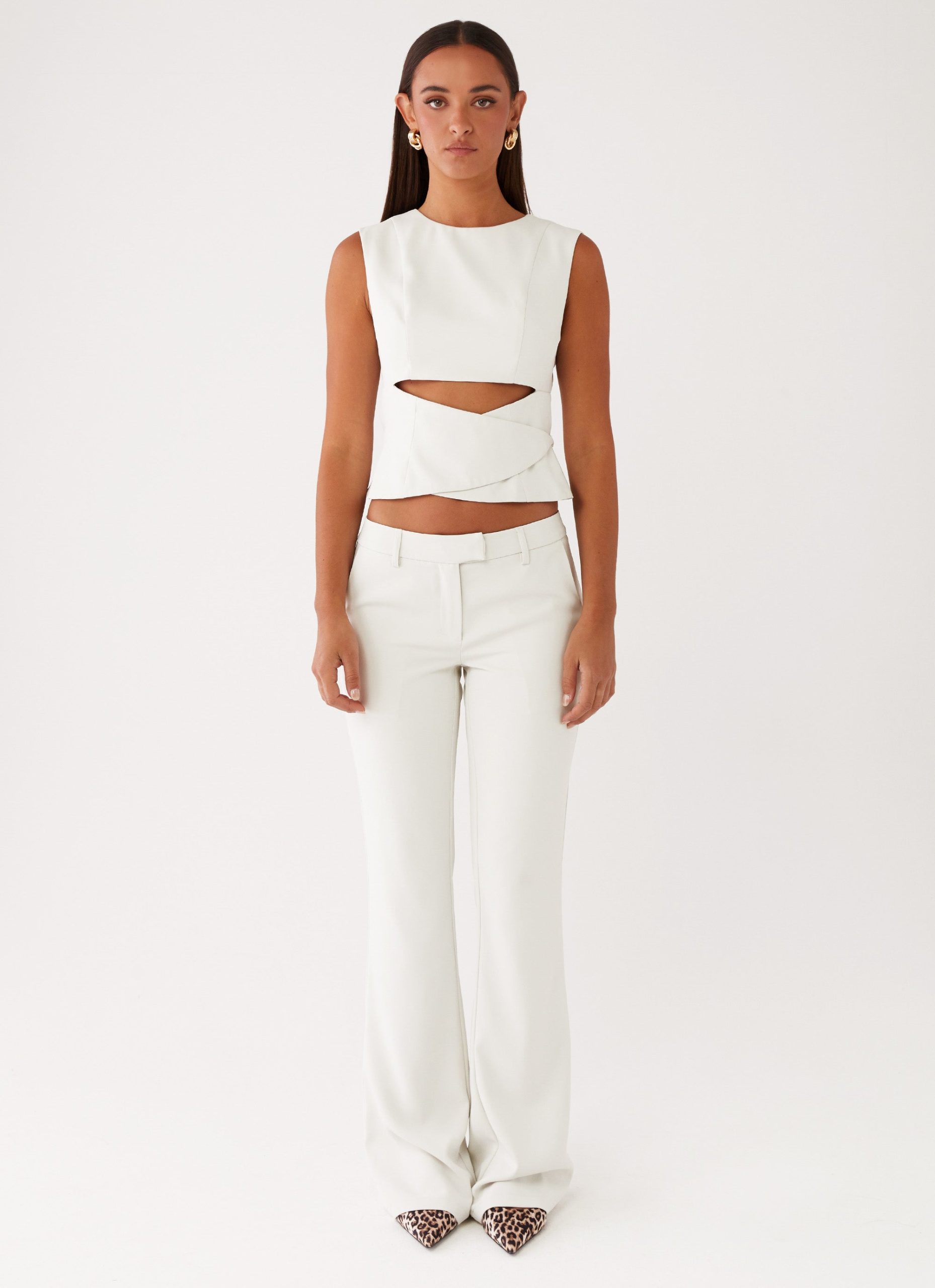 The Cyra Wrap Top showcases a chic rounded neckline and an open back for a daring touch. Its belt loops offer versatile styling options. allowing you to cinch the waist for a tailored look or leave it relaxed.
