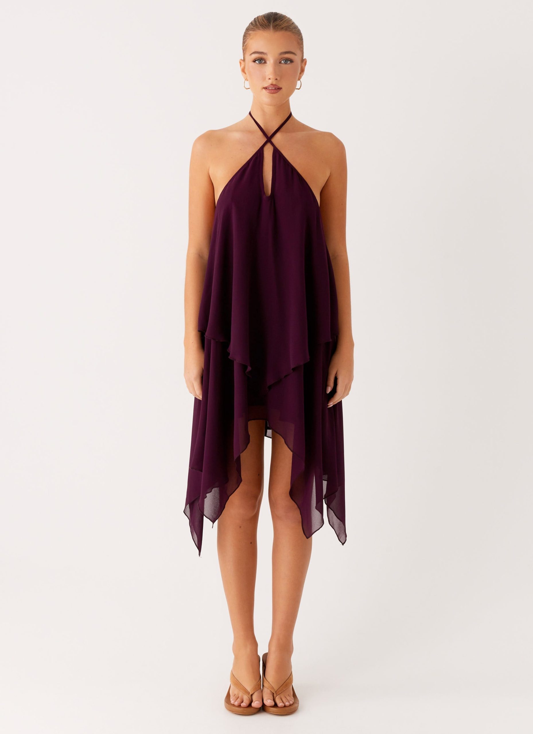 Step into twilight elegance with the Dalenti Midi Dress in plum. Featuring a halter neckline and a front keyhole cutout. this dress boasts an asymmetrical hemline and exclusive print that’s made to turn heads. The open back with a thin neck tie strap adds a touch of allure—perfect for those golden hour vibes that carry you into the night.