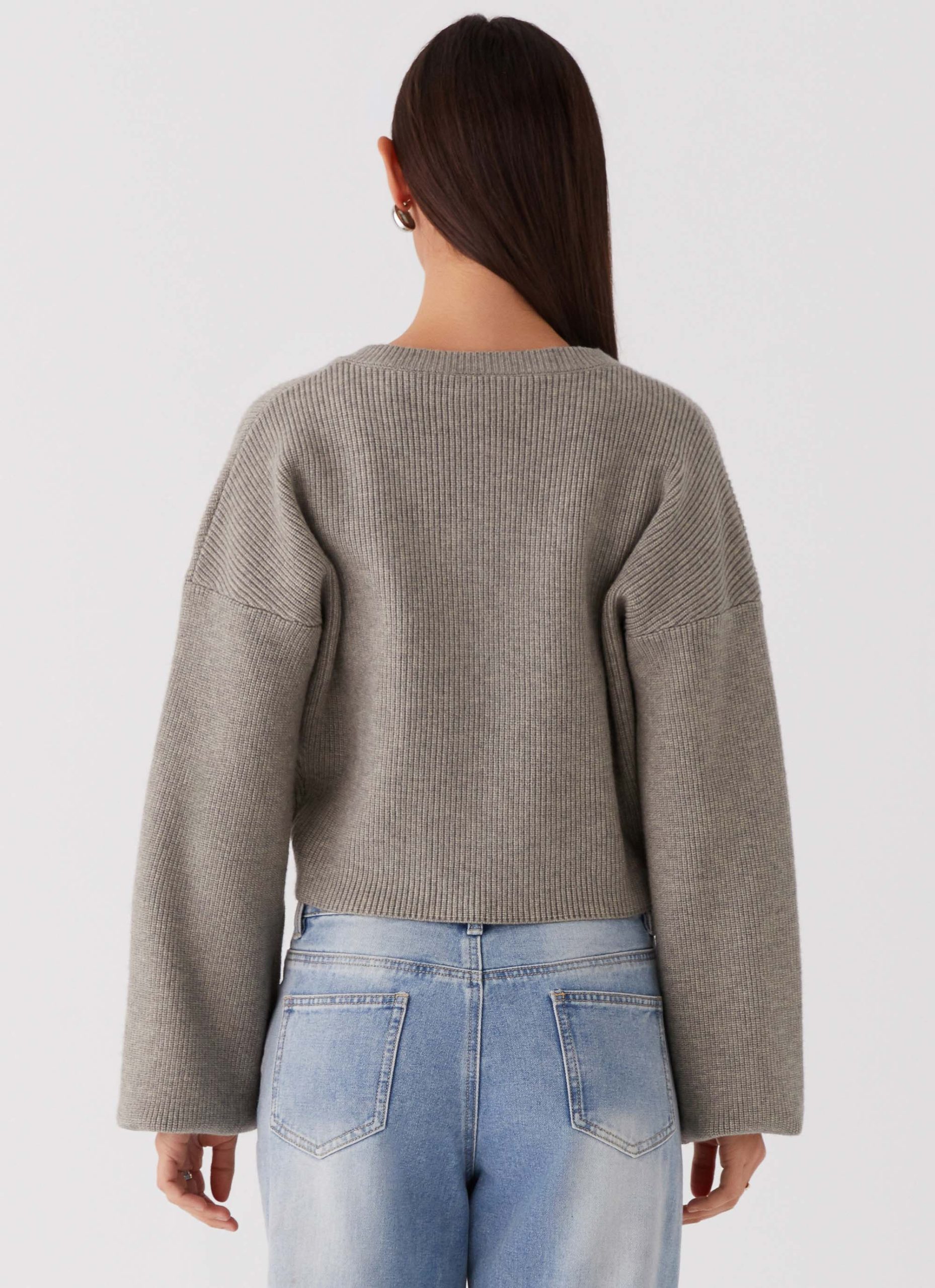 Step into the night with our Daphne Knit Cardigan in light grey. With its cozy round crew neck and wide. oversized sleeves. it offers both warmth and style for your nighttime adventures.