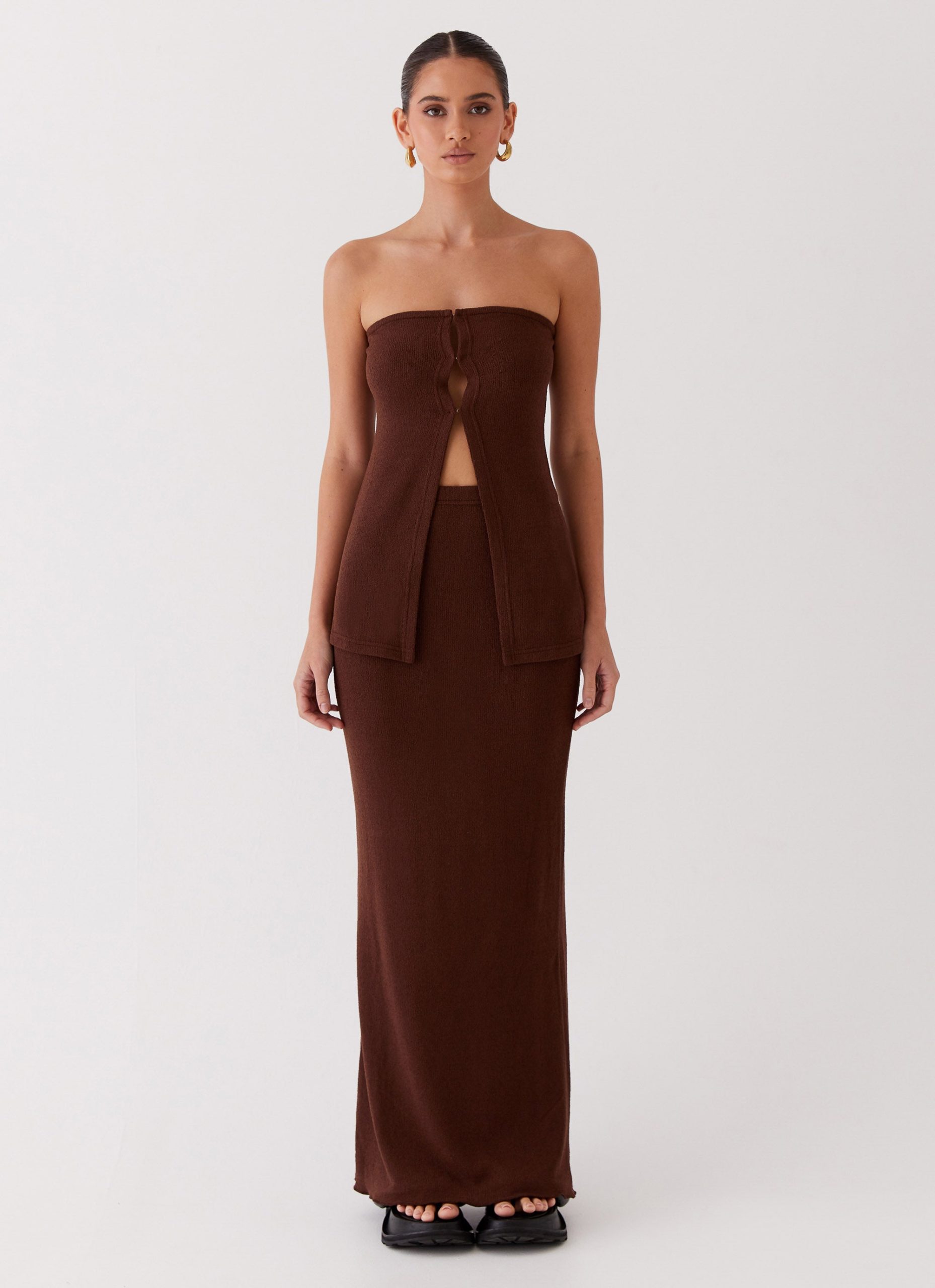 Unveiling the Delicate Lady Knit Top. perfect for evening elegance and nighttime allure with its chic strapless neckline and stylish open split hem