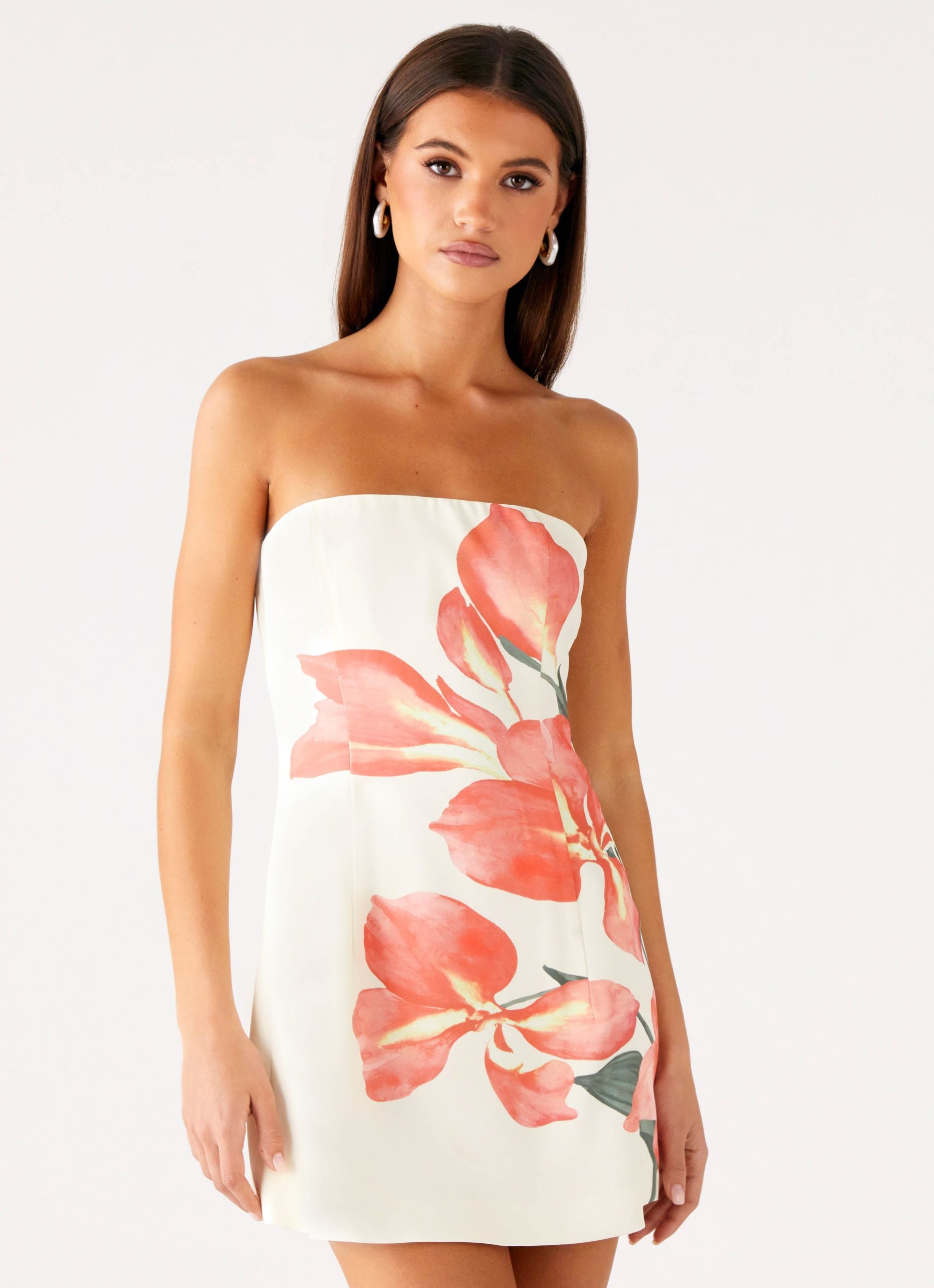 This strapless mini dress combines elegance with a contemporary twist. featuring silicone neckline taping to ensure a secure fit. The side hook-and-eye fastening and invisible zipper offer practicality. while the exclusive print and unique placement make this dress a must-have for your collection.