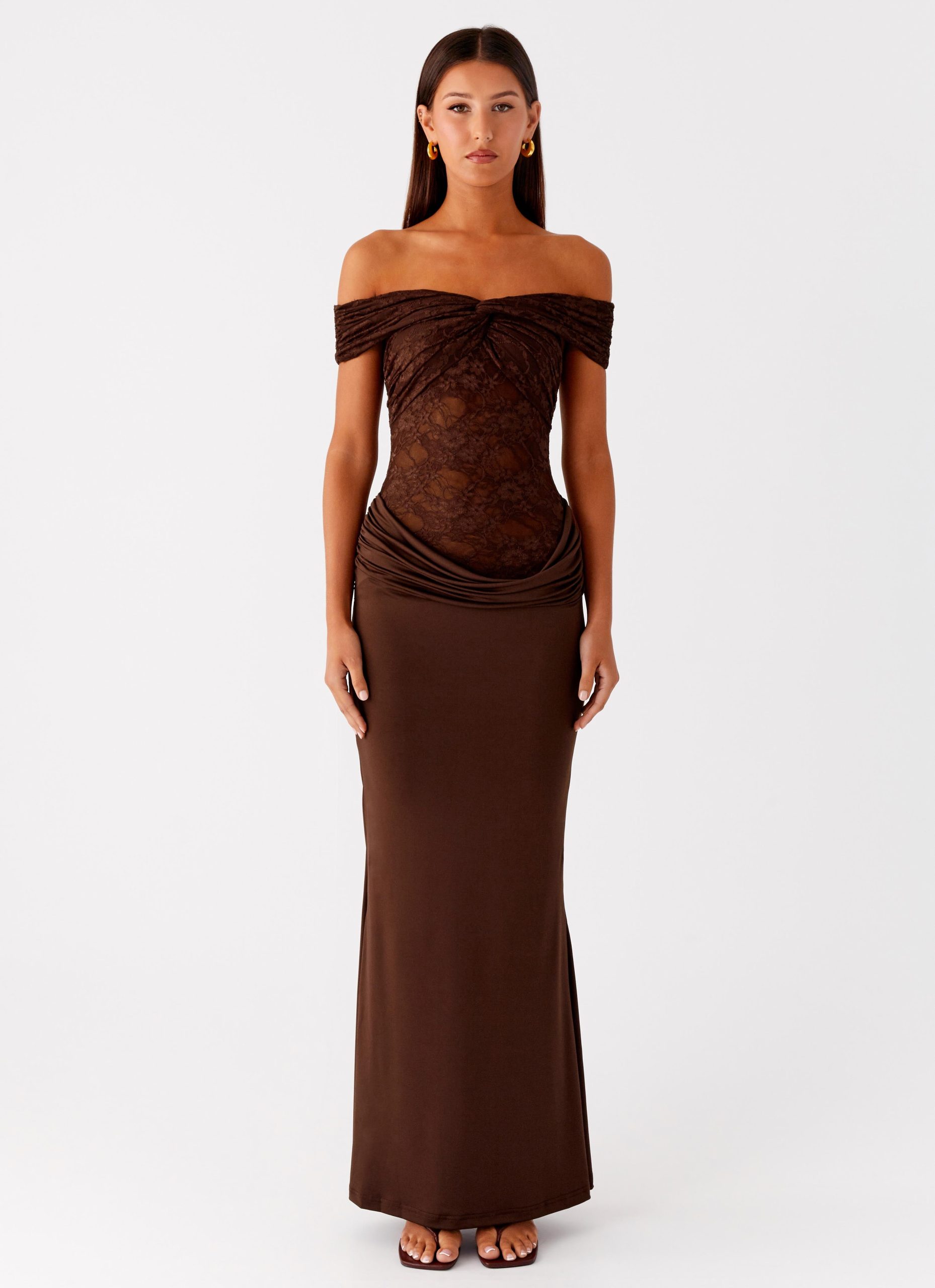 The Either Way Maxi Dress flows effortlessly from sunset to midnight. Featuring an off-the-shoulder neckline and a semi-sheer lace bodice. this fully lined bodycon maxi is sculpted with a draped waistband for a flattering silhouette. Perfect for embracing the golden hour glow with feminine ease.