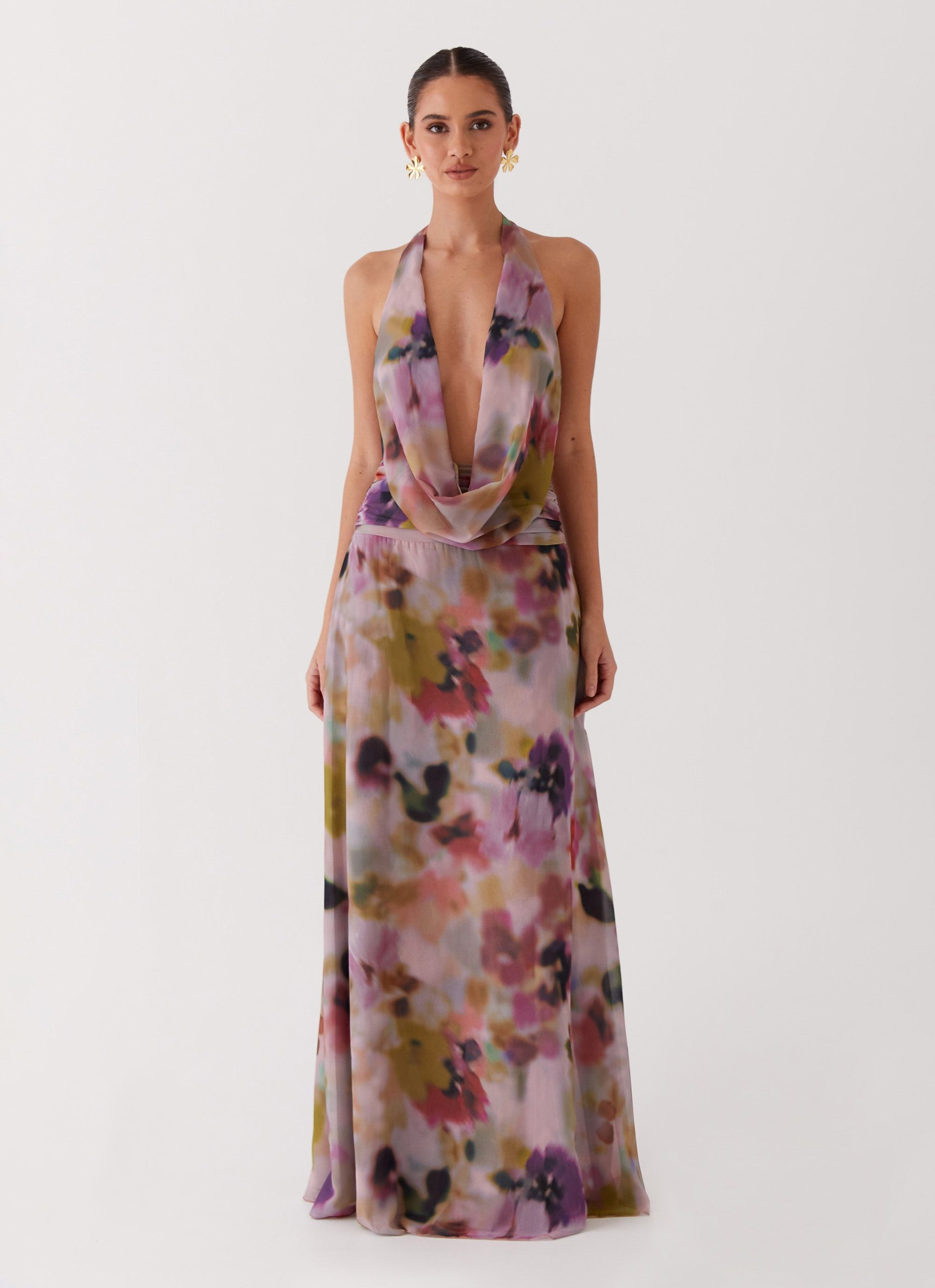 Step into the spotlight with our best-selling Elysia Chiffon Maxi Dress. Featuring a low cowl neckline and an open back. crafted from a classic black chiffon. it exudes night-time elegance.