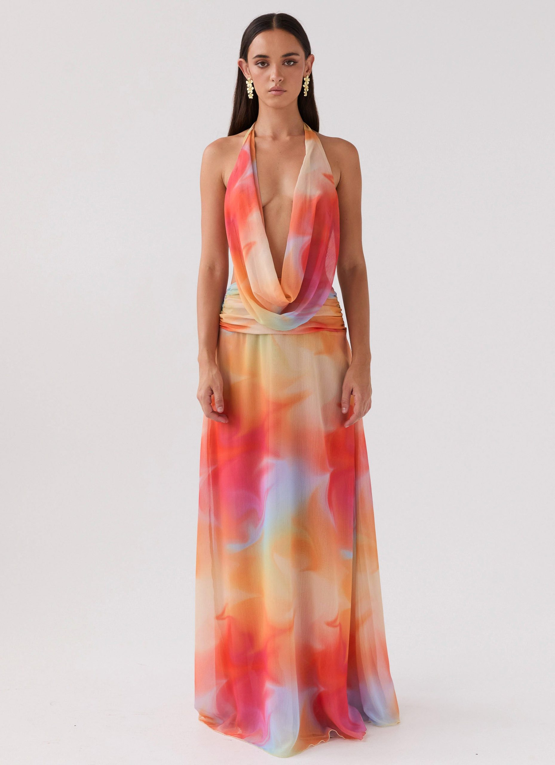 Introducing our best-selling Elysia Chiffon Maxi Dress. With its low cowl neckline and open back. crafted in a exclusive Peppermayo print. it’s designed to shine under the nightclub silhouettes. Elevate your ensemble with heels and hoops for a stellar look that commands the spotlight.