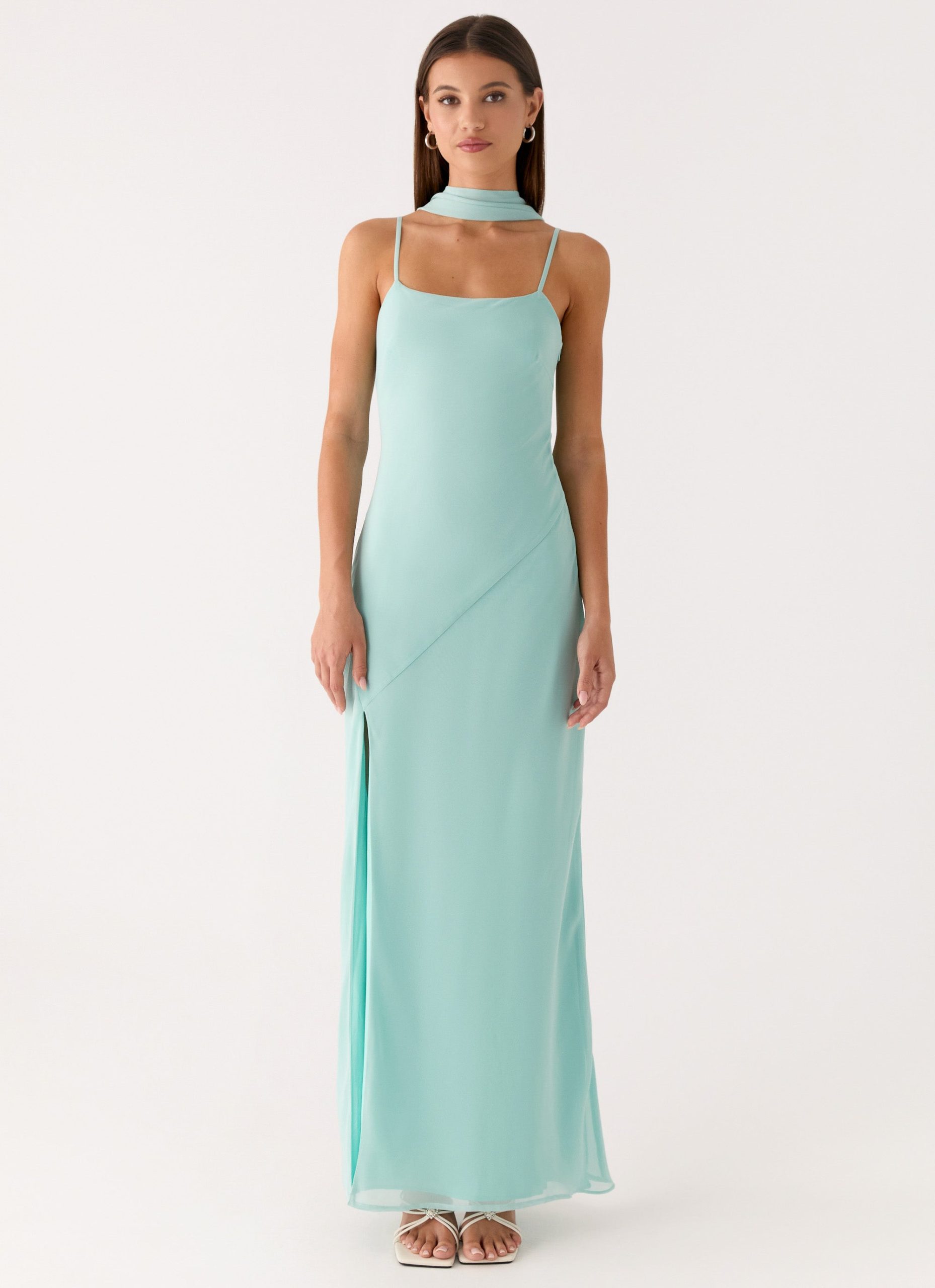 The Eternelle Square Neck Maxi Dress is a chic and elegant choice for any occasion. Featuring a square neckline with scarf detailing. thin adjustable straps. and a high slit. this fully lined maxi dress combines sophistication with effortless movement.