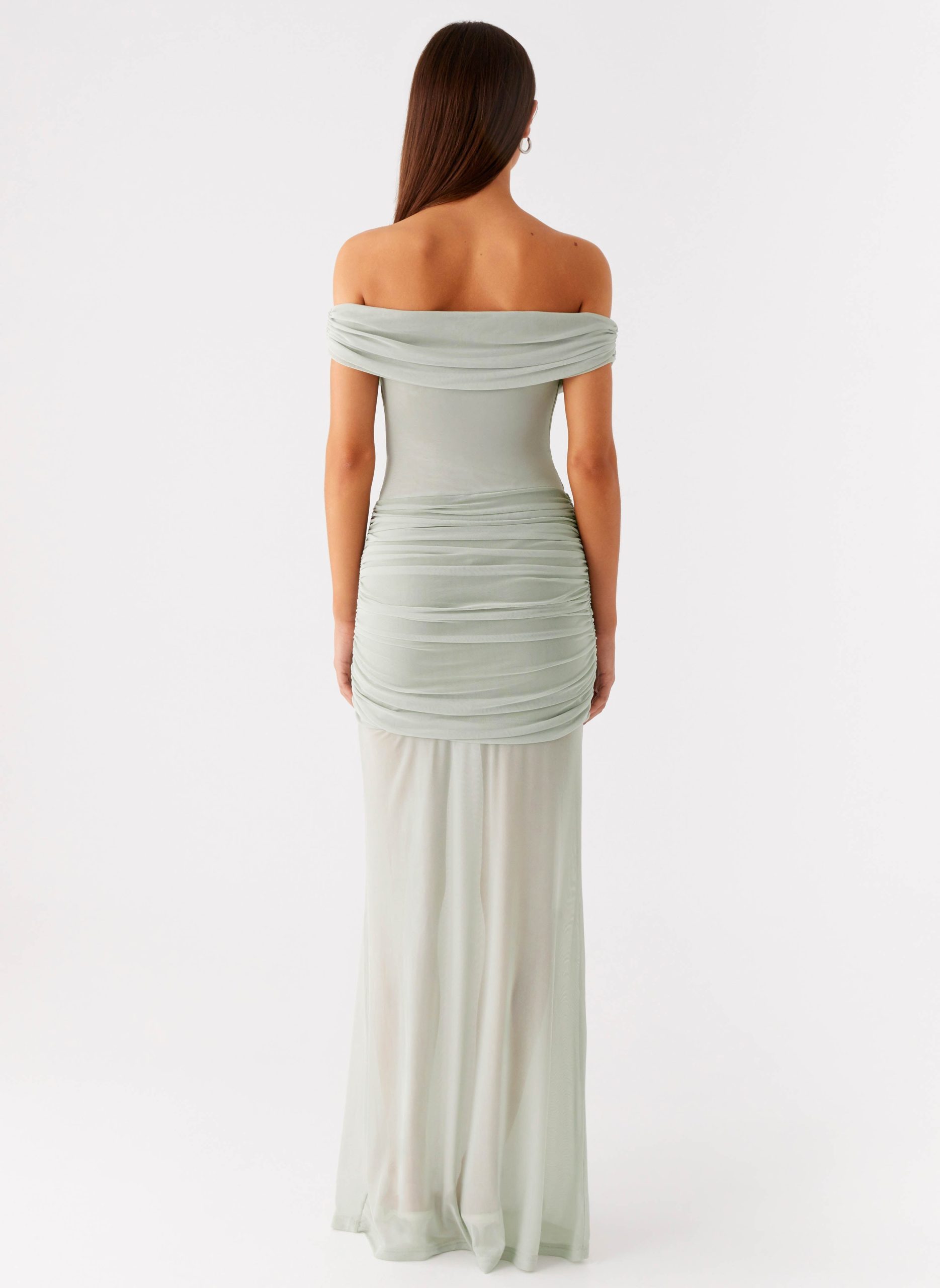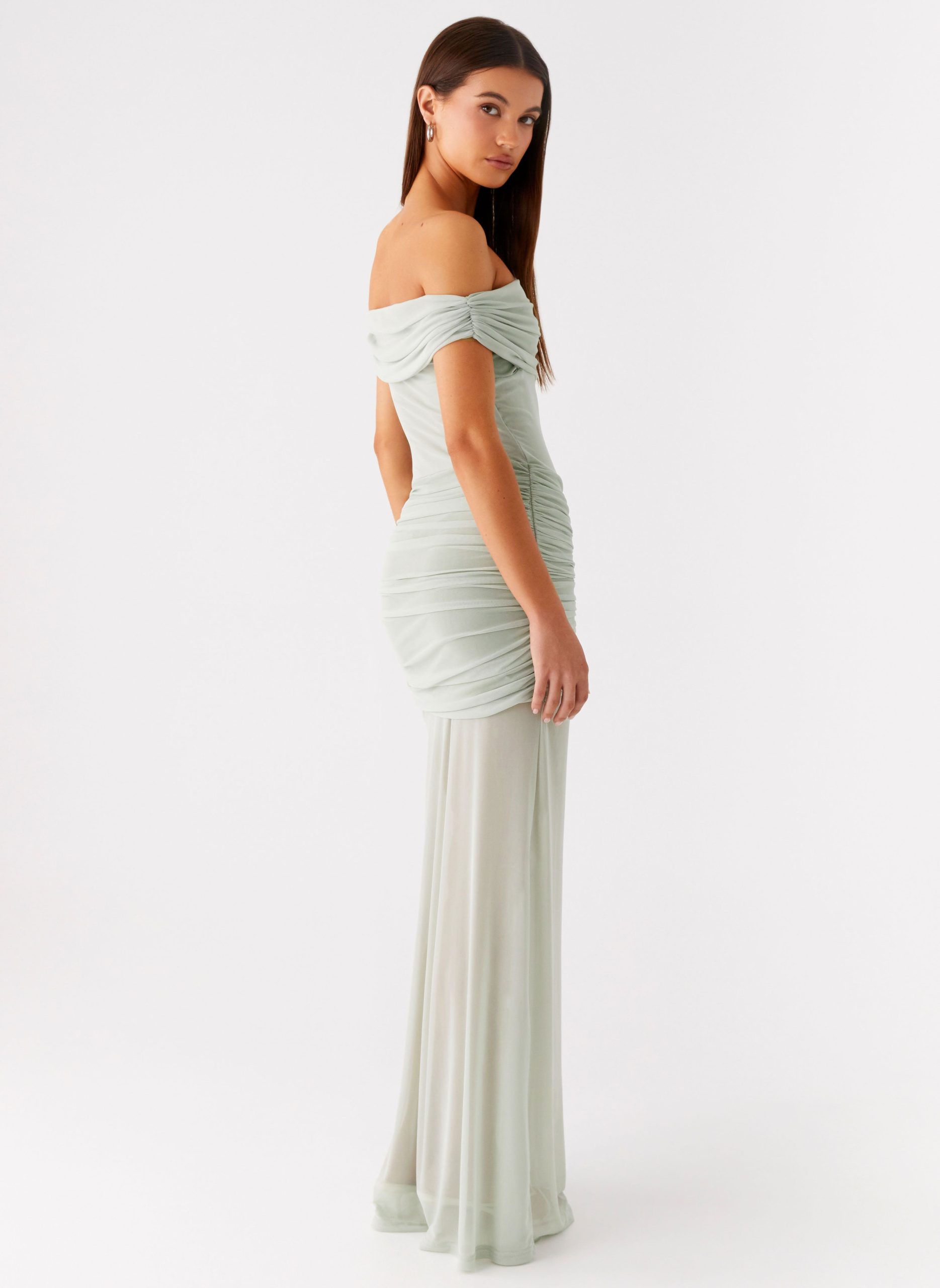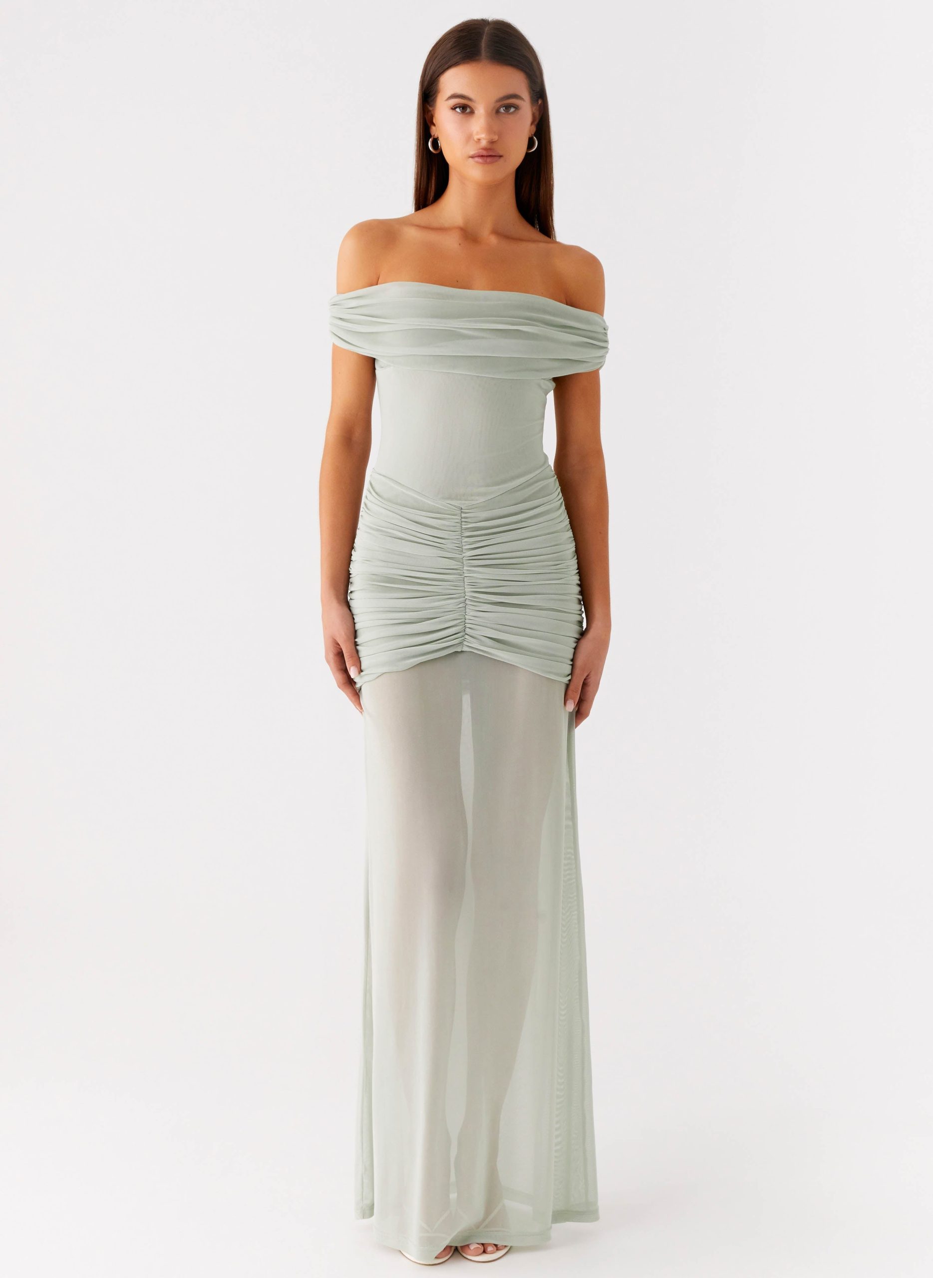 The Eyllin Off Shoulder Maxi Dress captures effortless elegance from sunset to the dance floor. Featuring a ruched off-shoulder neckline with silicone taping and elasticated trim for a secure fit. this stretch mesh dress combines a lined bustier and waistband with a semi-sheer bodice and skirt for a sultry yet sophisticated look. The ruched shoulder seam and front waistband add flattering detail to the maxi-length silhouette.
