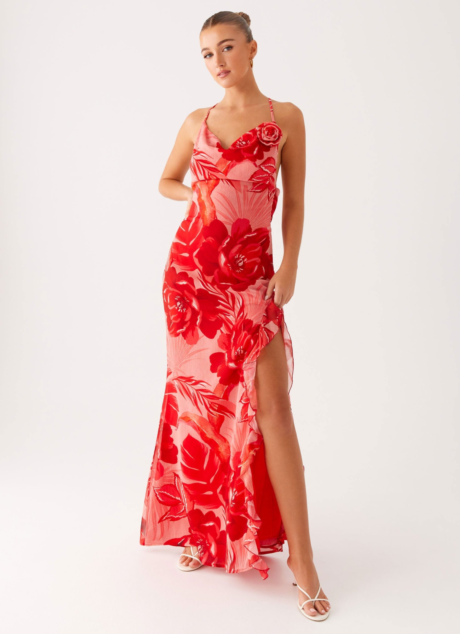 The First Class Maxi Dress is made for golden skies and nights that feel endless. Featuring a low front cowl. open back. and bold flower embellishment. it’s wrapped in our exclusive Sicily Sunsets print for a look that turns every moment into a destination.