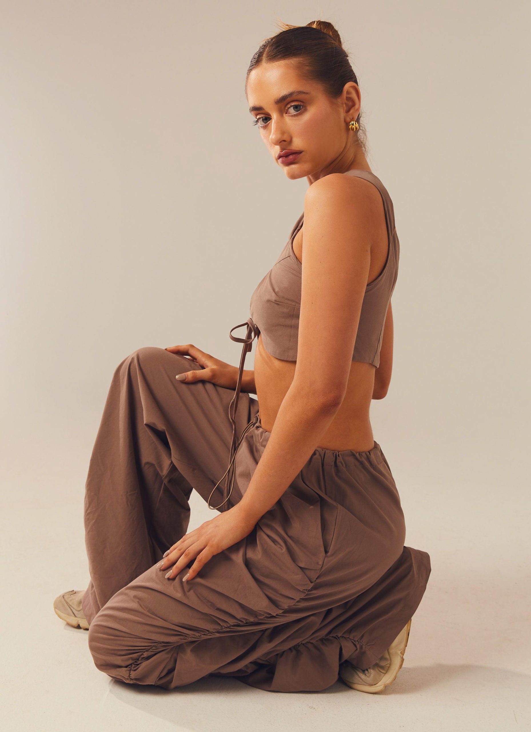 Neutral vibes! Our Fluorescent Nights Pants feature an elastic waistband and toggle drawstring. ruching down the legs and 2 front pockets. Pair with our Next In Line Crop Top.
