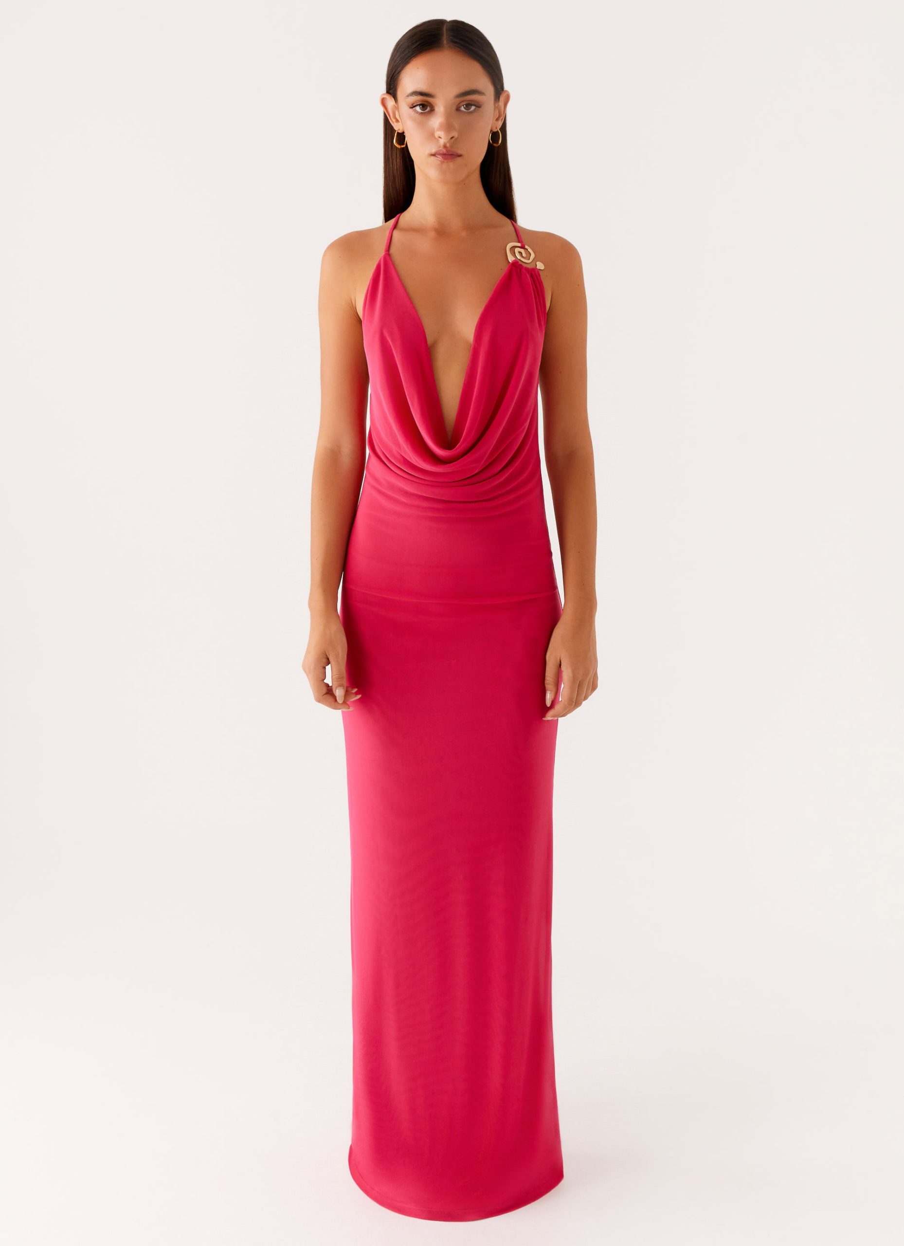 Play to win. The Game Player Maxi Dress brings drama after dark with a low front cowl and barely-there thin straps. Liquid-like drape meets a floor-skimming silhouette—made for golden hour entrances and moonlit exits.