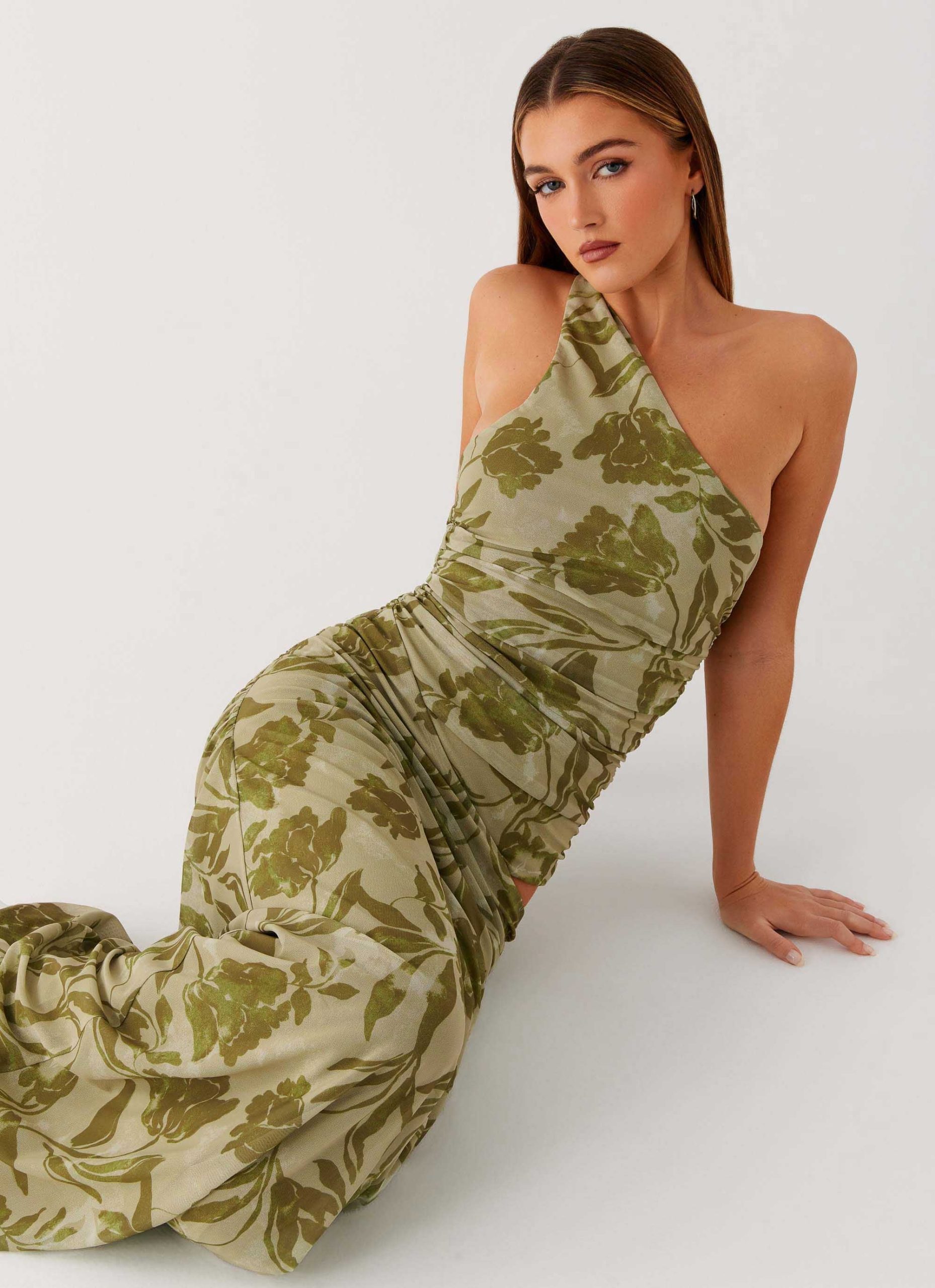 The Georgiana Maxi Dress features a maxi length with an asymmetrical neckline and ruched sides for a flattering silhouette. Crafted from stretch mesh and fully lined. it showcases an exclusive print that adds a unique touch to this elegant design.