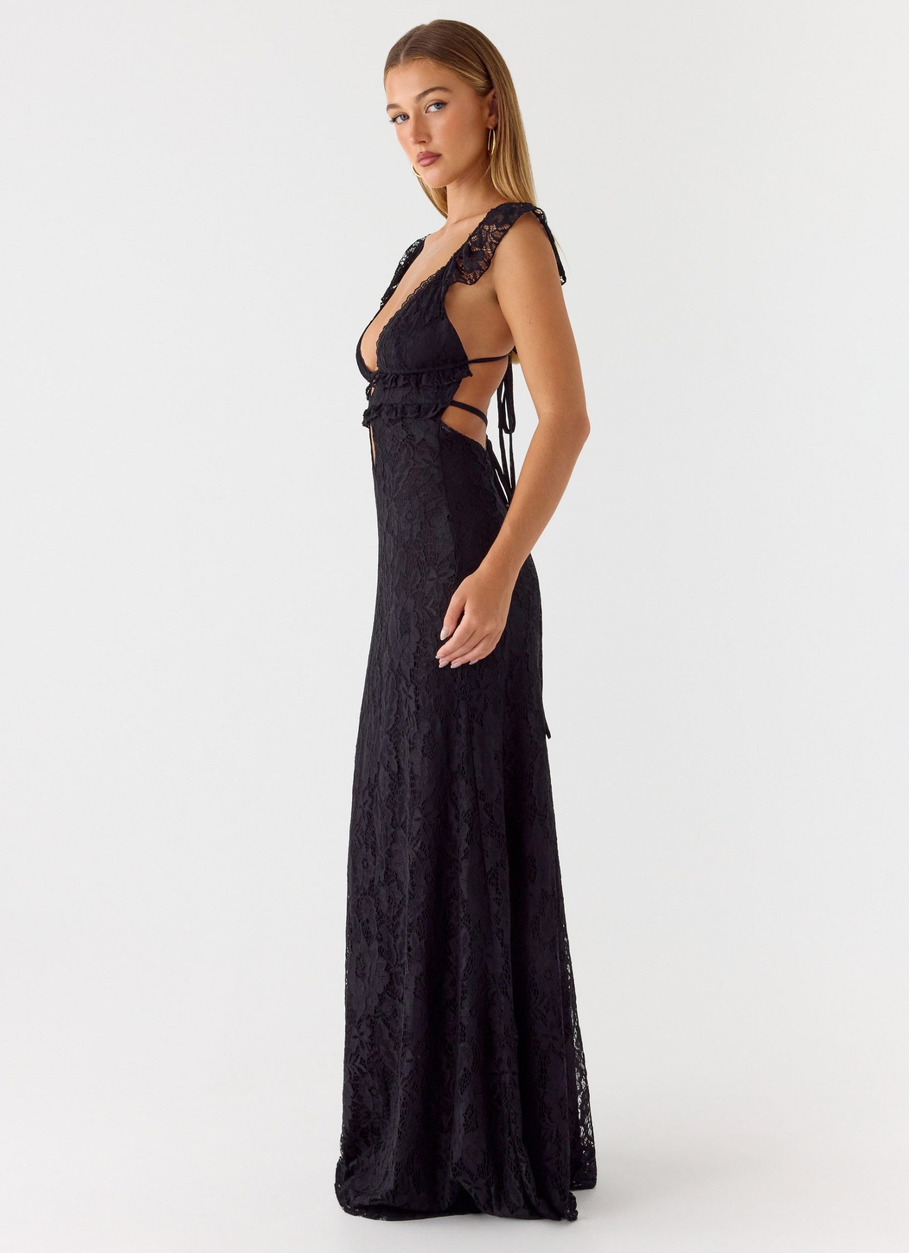 The Giulia Lace Maxi Dress is a romantic. body-flattering silhouette designed for elegant evenings. Featuring keyhole and ruffle detailing with a low back. it drapes beautifully while the stretch lace provides comfort and movement. A long back tie adds a customizable. feminine finish.