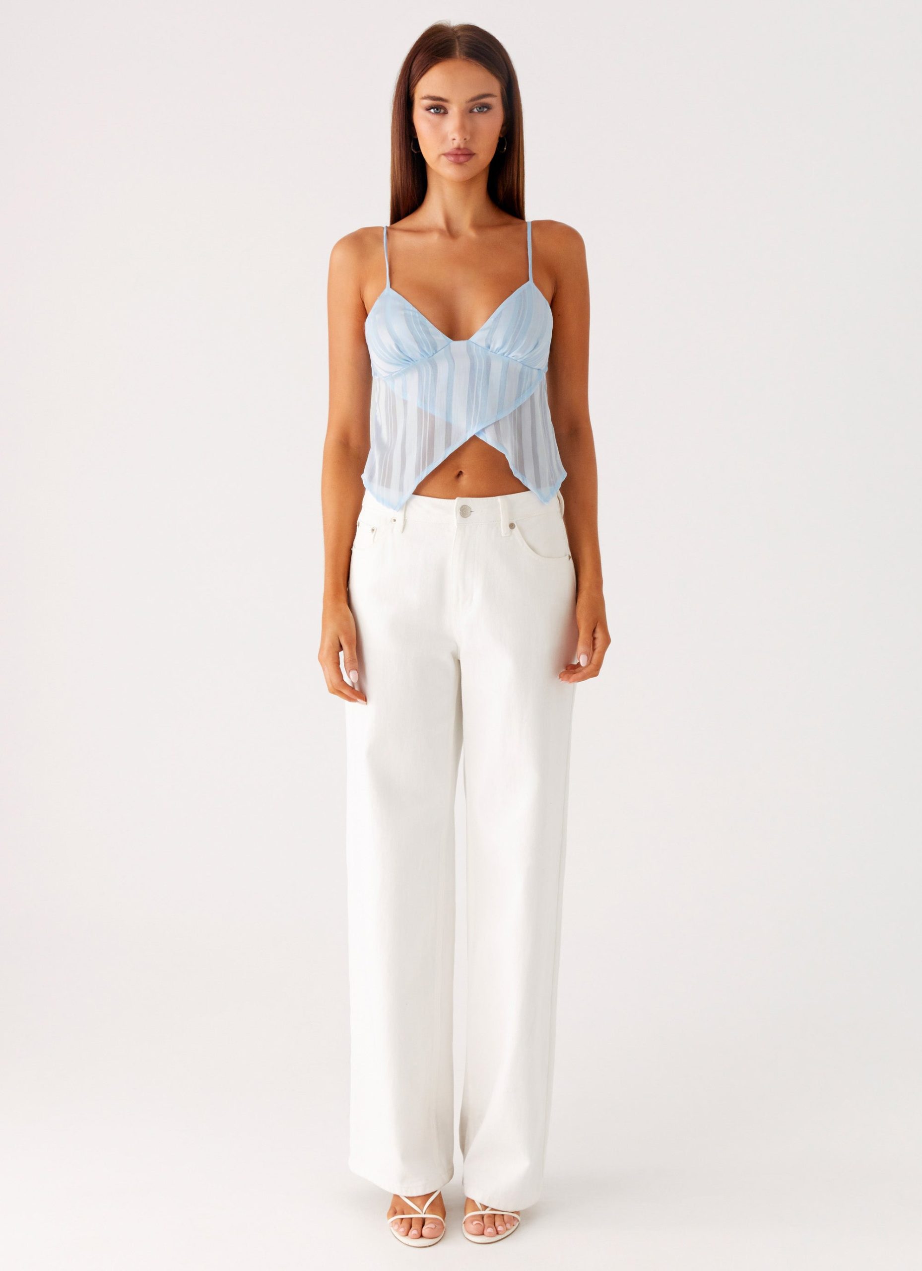 The Glynne Frill Top is a dreamy. feminine piece perfect for day-to-night styling. Featuring a flattering V neckline with adjustable straps and a fold-over frill detail. this top is crafted from sheer fabric and fully lined for comfort. it’s the perfect balance of chic and playful.