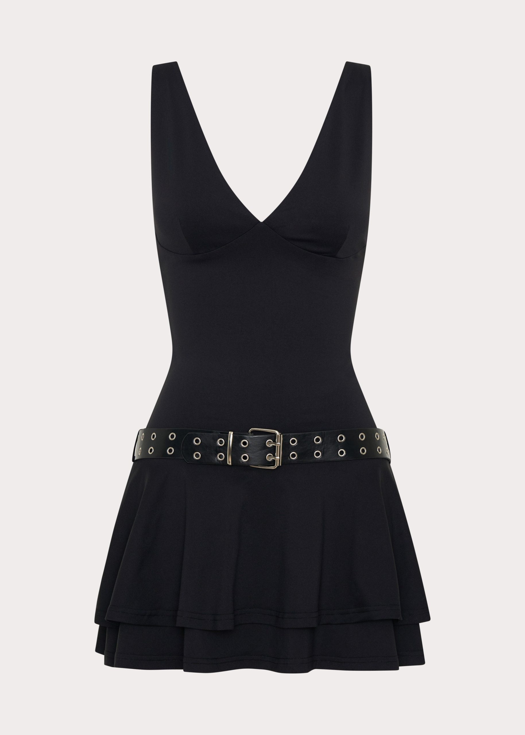 Chic with a hint of edge. the Gold Coast Mini Dress in Black is your go-to for nights that never slow down. Featuring a low front neckline. A-line skirt. and a belted waist with loops. it’s made to flatter. define. and turn heads.