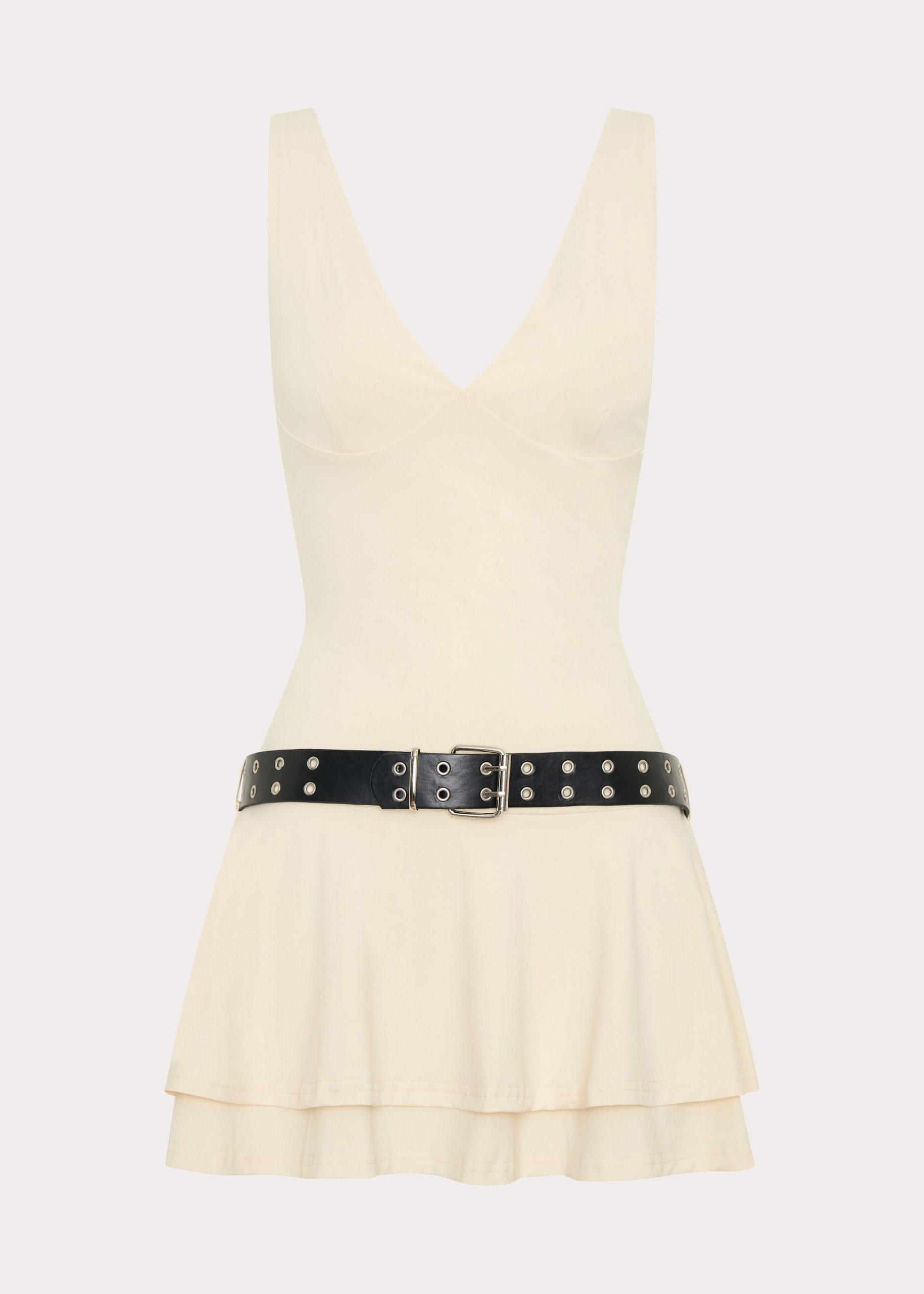 Chic with a hint of edge. the Gold Coast Mini Dress is your go-to for nights that never slow down. Featuring a low front neckline. A-line skirt. and a belted waist with loops. it’s made to flatter. define. and turn heads.