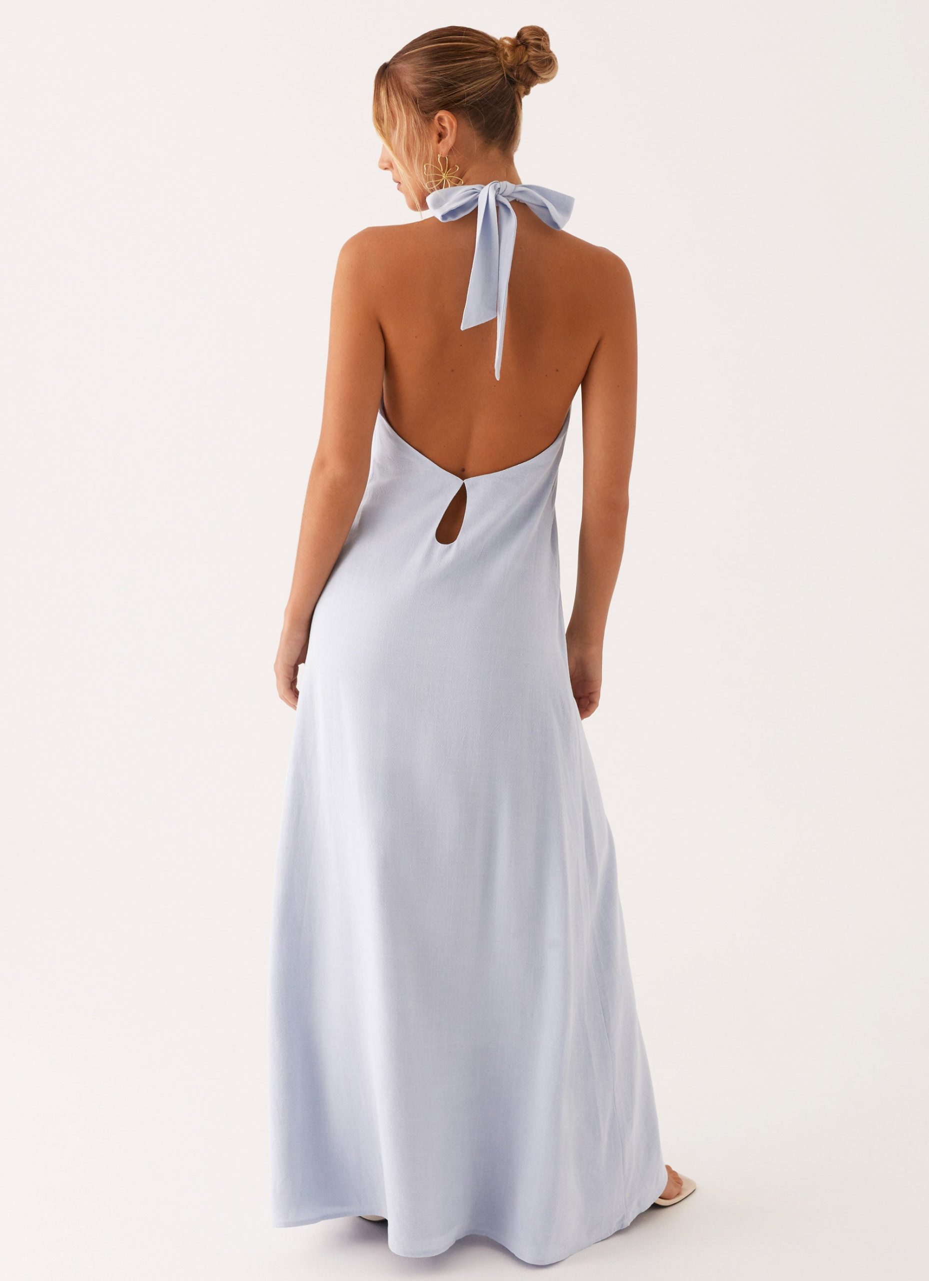 The Golden Child linen maxi dress is a timeless and elegant piece perfect for warm days and special occasions. Featuring a halter neck and thick straps for a structured look. it gracefully flows into an open back design that adds a touch of allure.