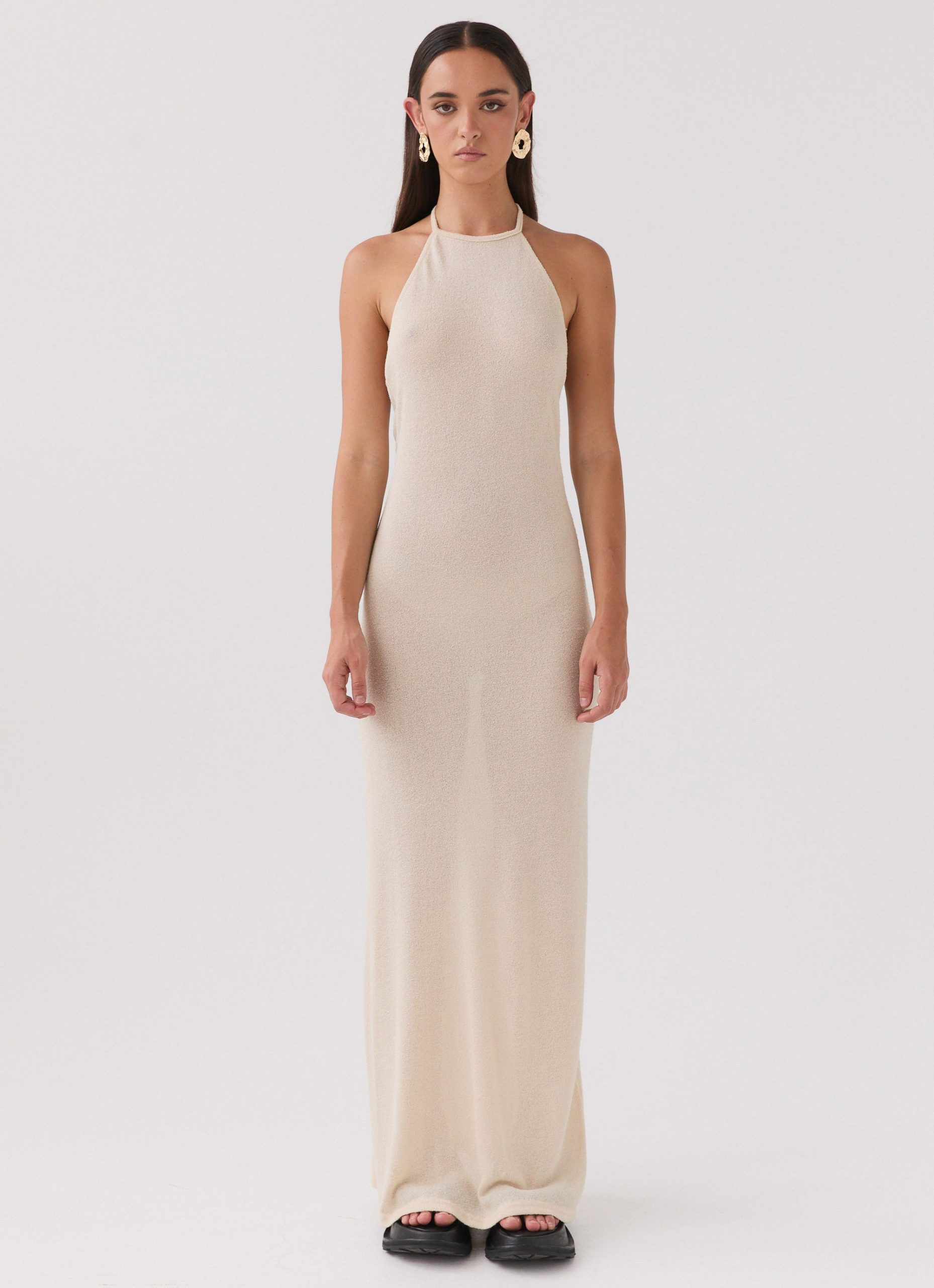 Introducing our Here With Me Knit Maxi Dress. a captivating piece designed for those enchanting PM moments. Featuring a semi-sheer design and an alluring open back. this dress is perfect for embracing golden skies. balmy nights. and the sleek silhouettes of nightclub scenes.