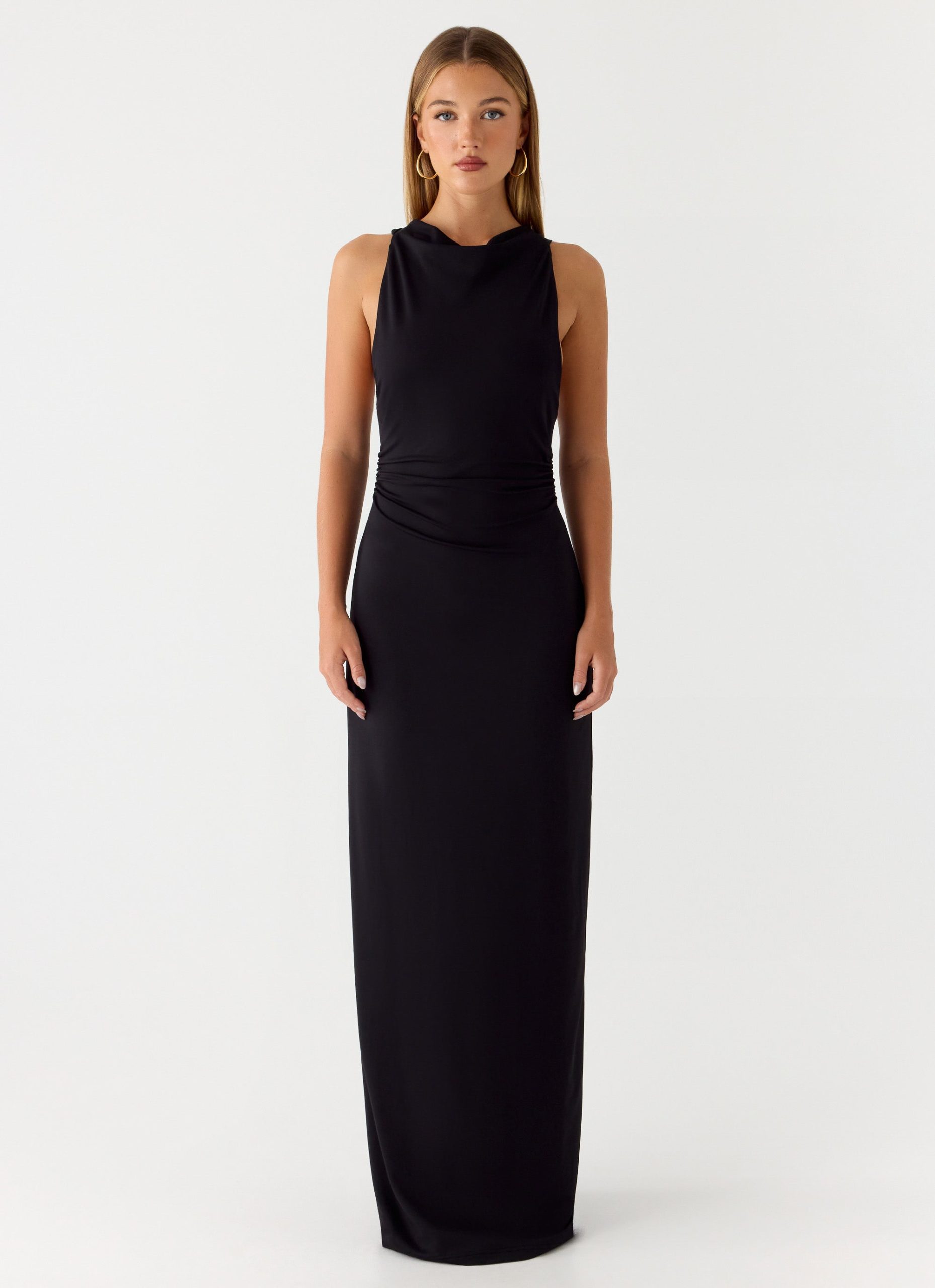 The Hidden Agenda Maxi Dress is crafted for elevated. modern evenings with a sleek. flowing silhouette. Featuring a high neckline and knot-back detailing with gathered waist. this jersey dress skims the body for a refined. statement-making look. Soft. drapey. and effortlessly chic. it’s designed to move with ease from day to night.