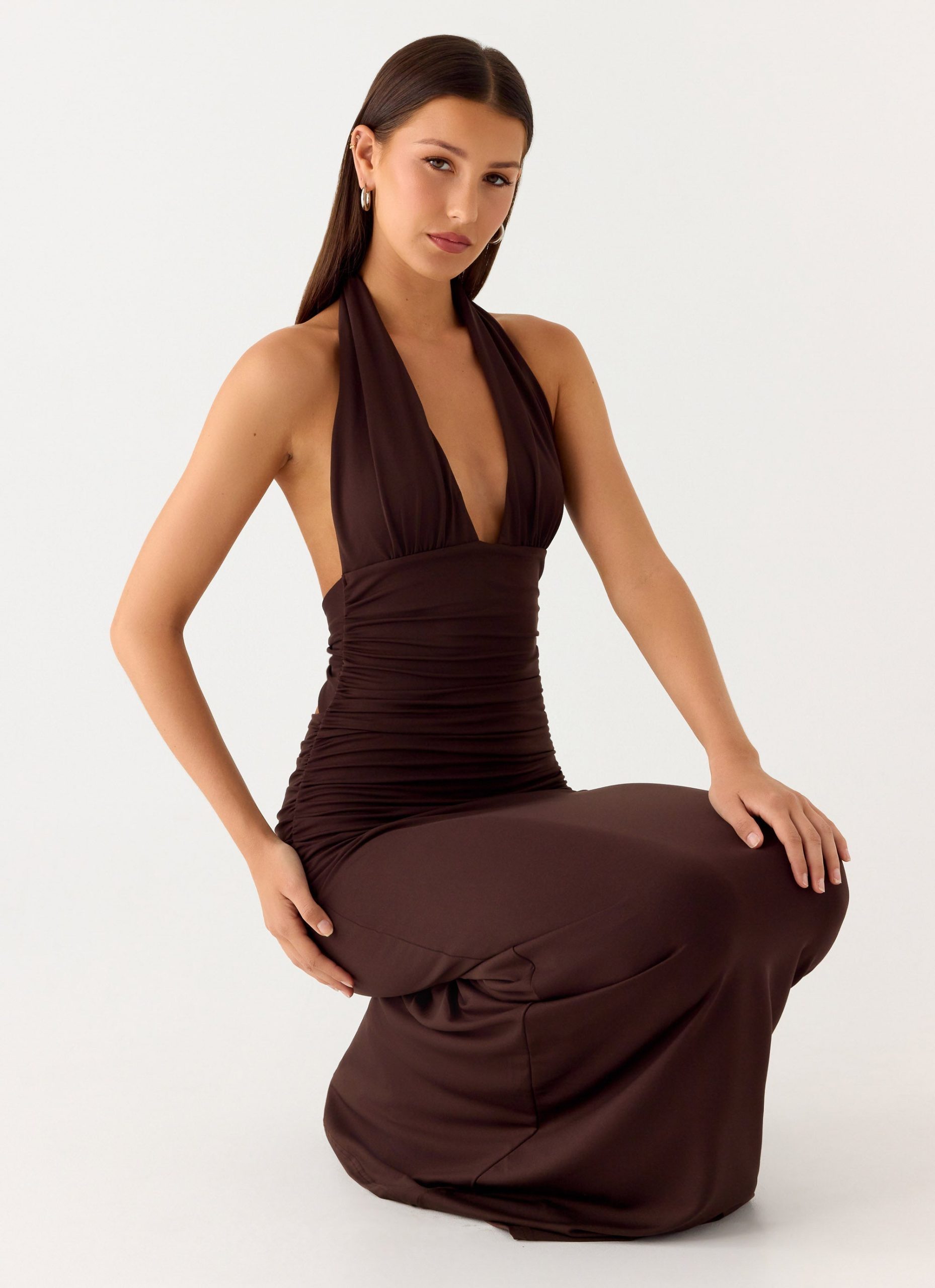 The Ilaria Halter Maxi Dress is a chic and versatile maxi featuring a V neckline. ruched detailing under the bust and along the sides. and a low back with a back tie for a flattering fit.