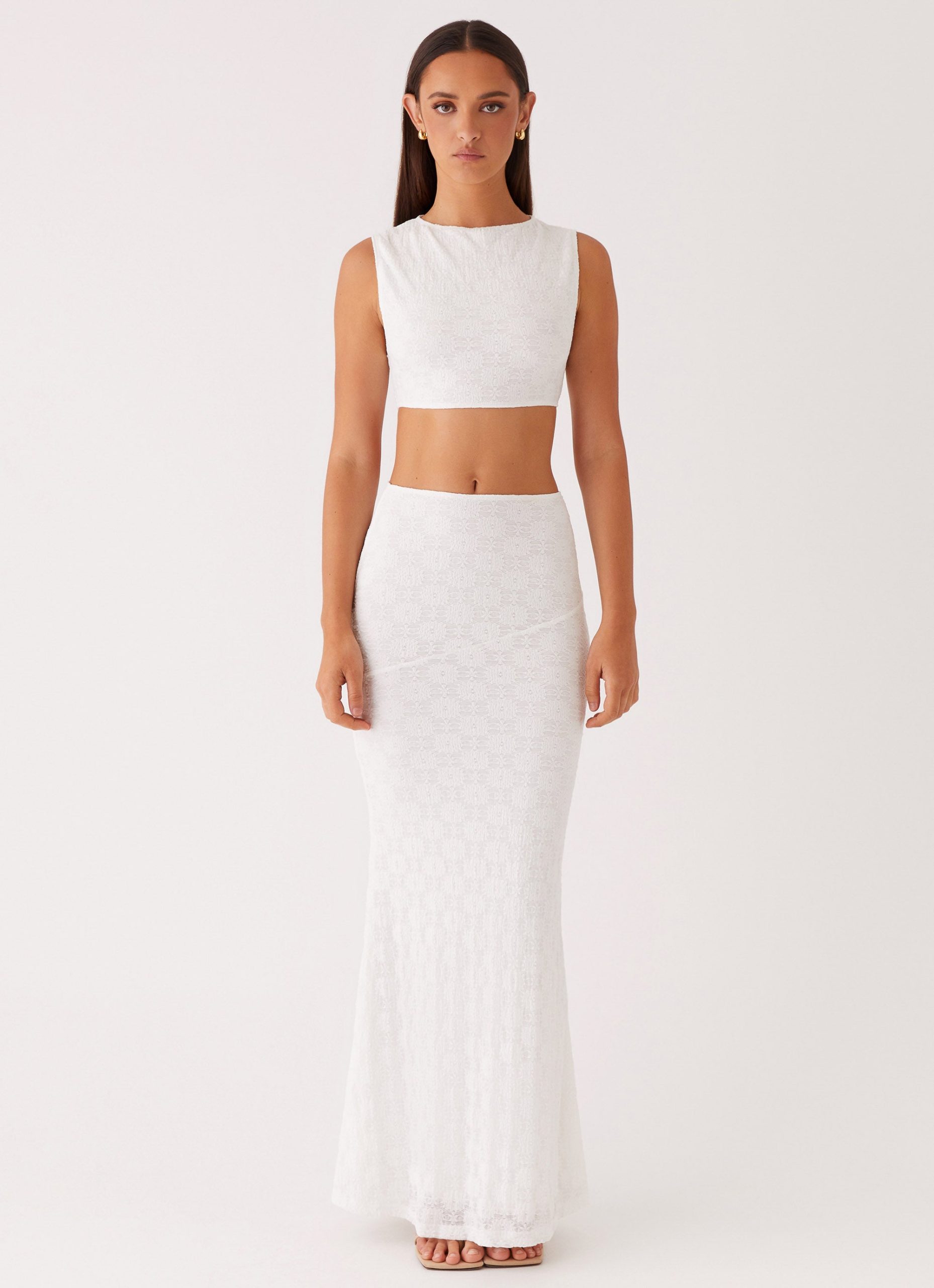 Elevate your evening ensemble with the Issey Crop Top. Boasting a high. wide neckline. this sleeveless top exudes modern elegance and refinement. The textured detailing adds depth and dimension. ensuring you stand out from the crowd with every step.