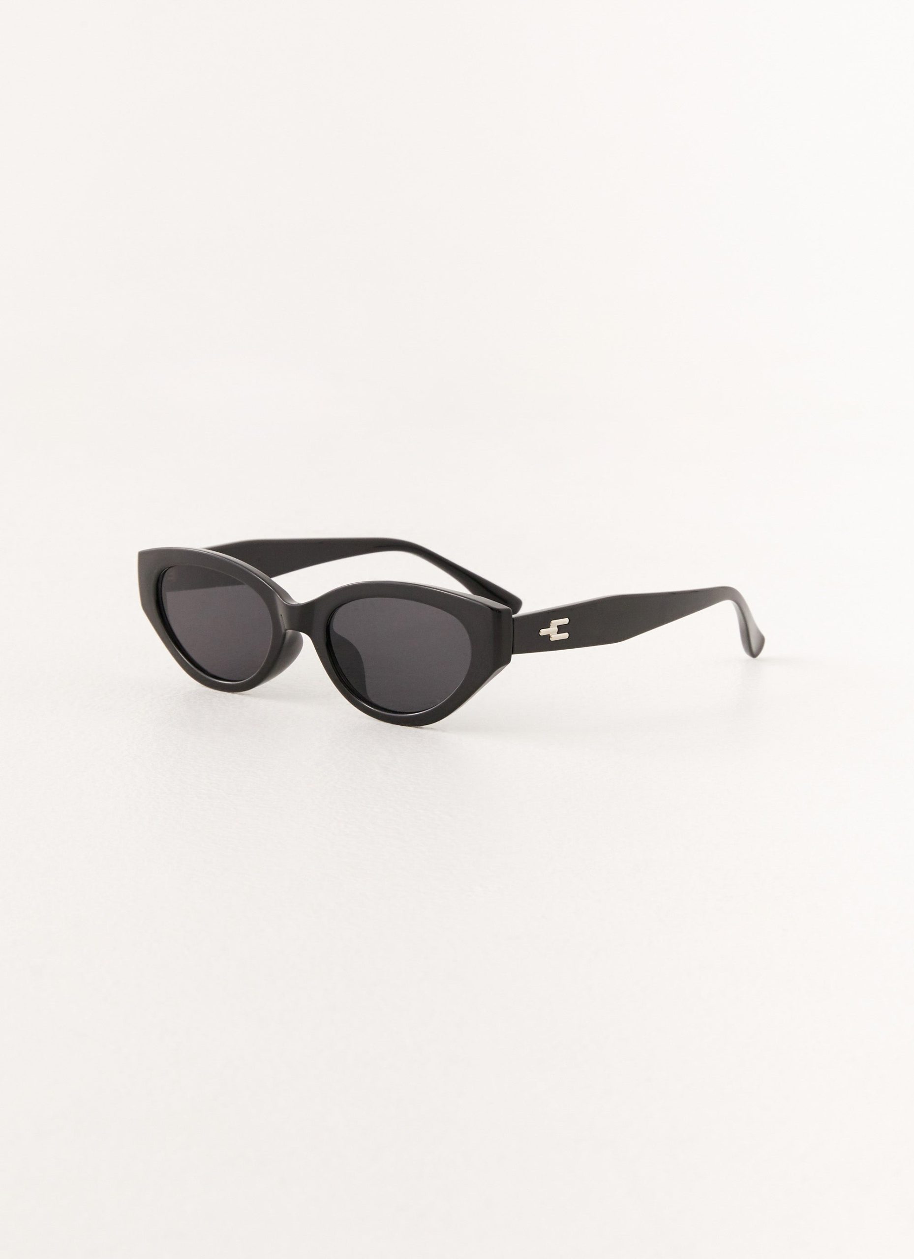 Janice Sunglasses featuring a sleek black frame and bold cat-eye shape. The ultimate after-dark statement accessory.