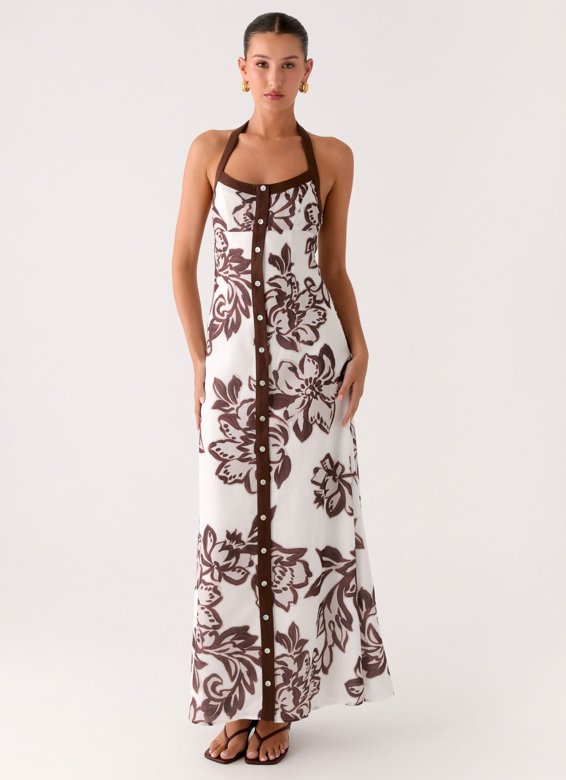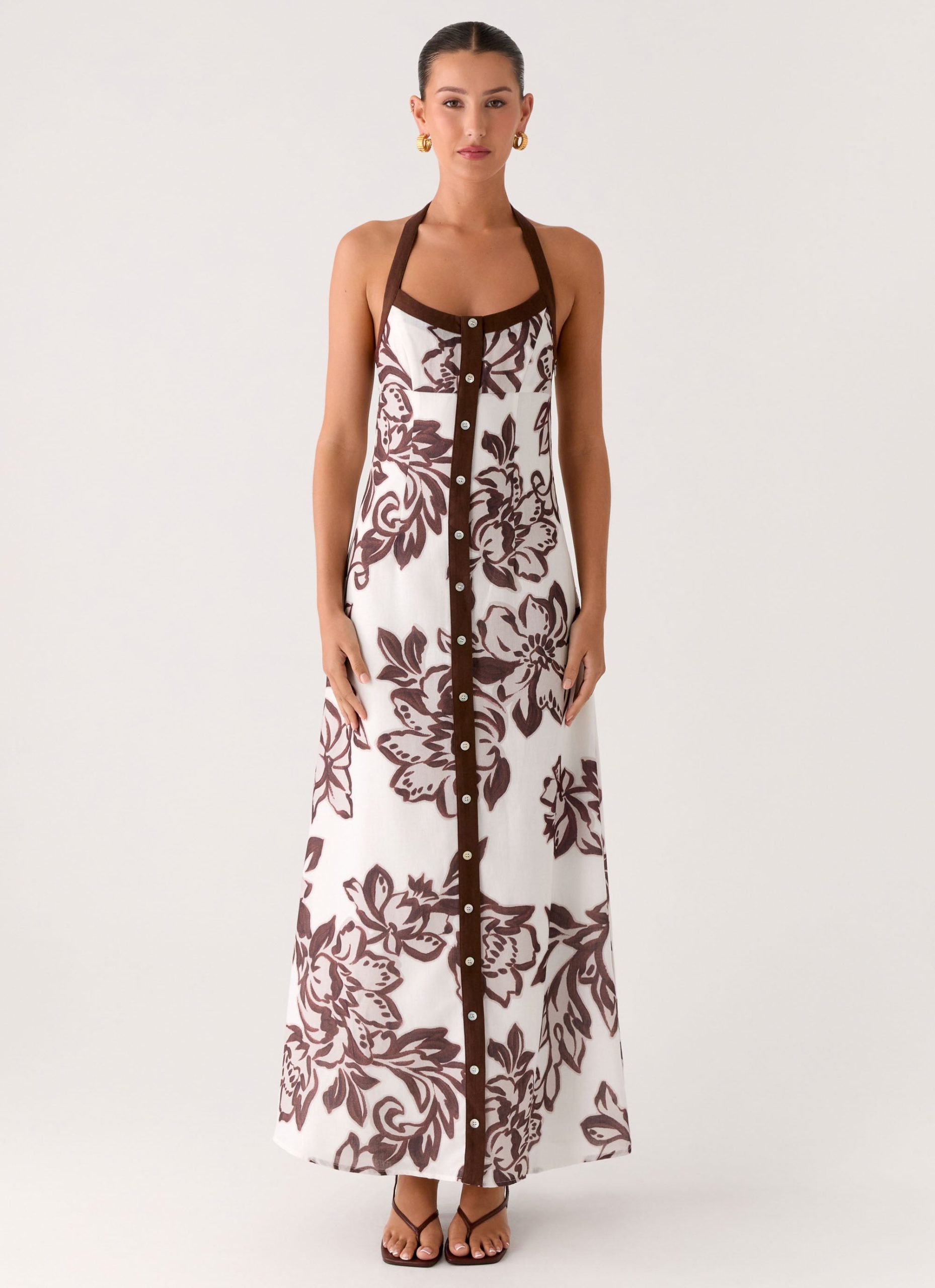 The Jovanni Maxi Dress blends vintage inspiration with modern design. featuring a scoop neckline. halter straps. and button front. Fully lined for comfort. this flowing maxi is your go-to for elevated ease.