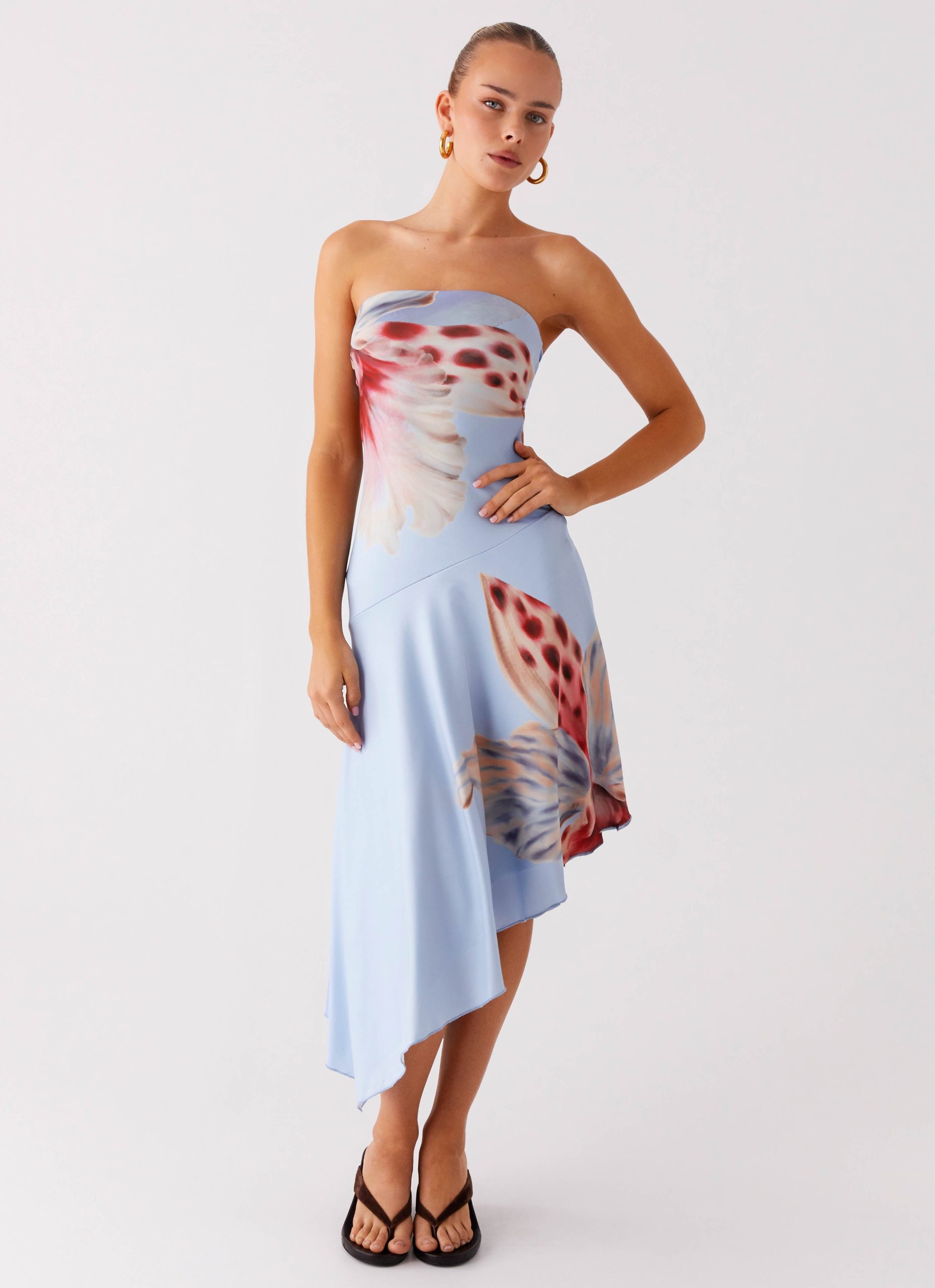 The Juliana Midi Dress is made for balmy nights and spontaneous plans. Featuring a strapless neckline with silicone taping for a secure fit. this stretch jersey silhouette hugs your curves with a low back and playful asymmetrical hem. Finished with a back tie and our exclusive print. it’s an effortless statement from sunset to dance floor.