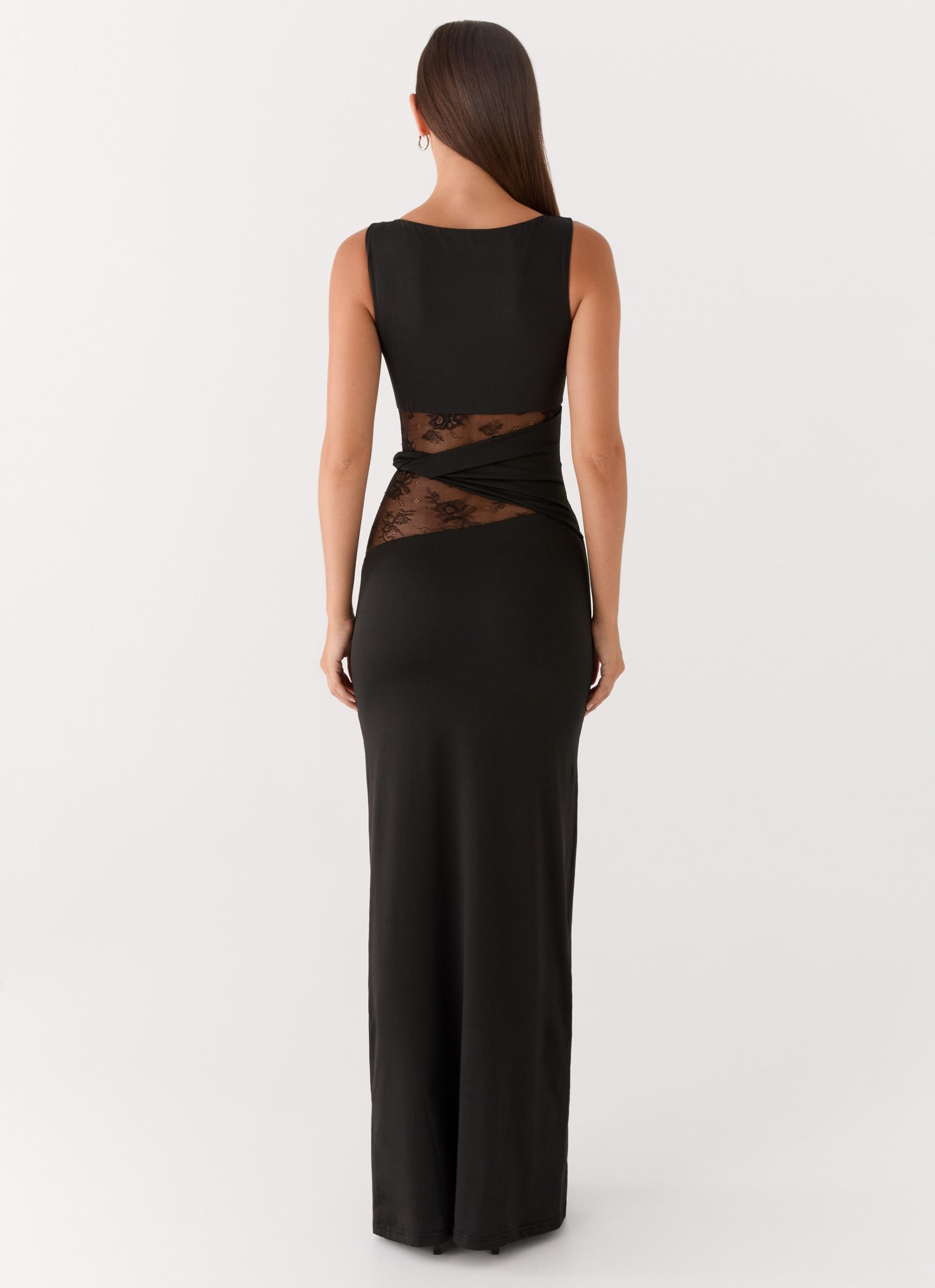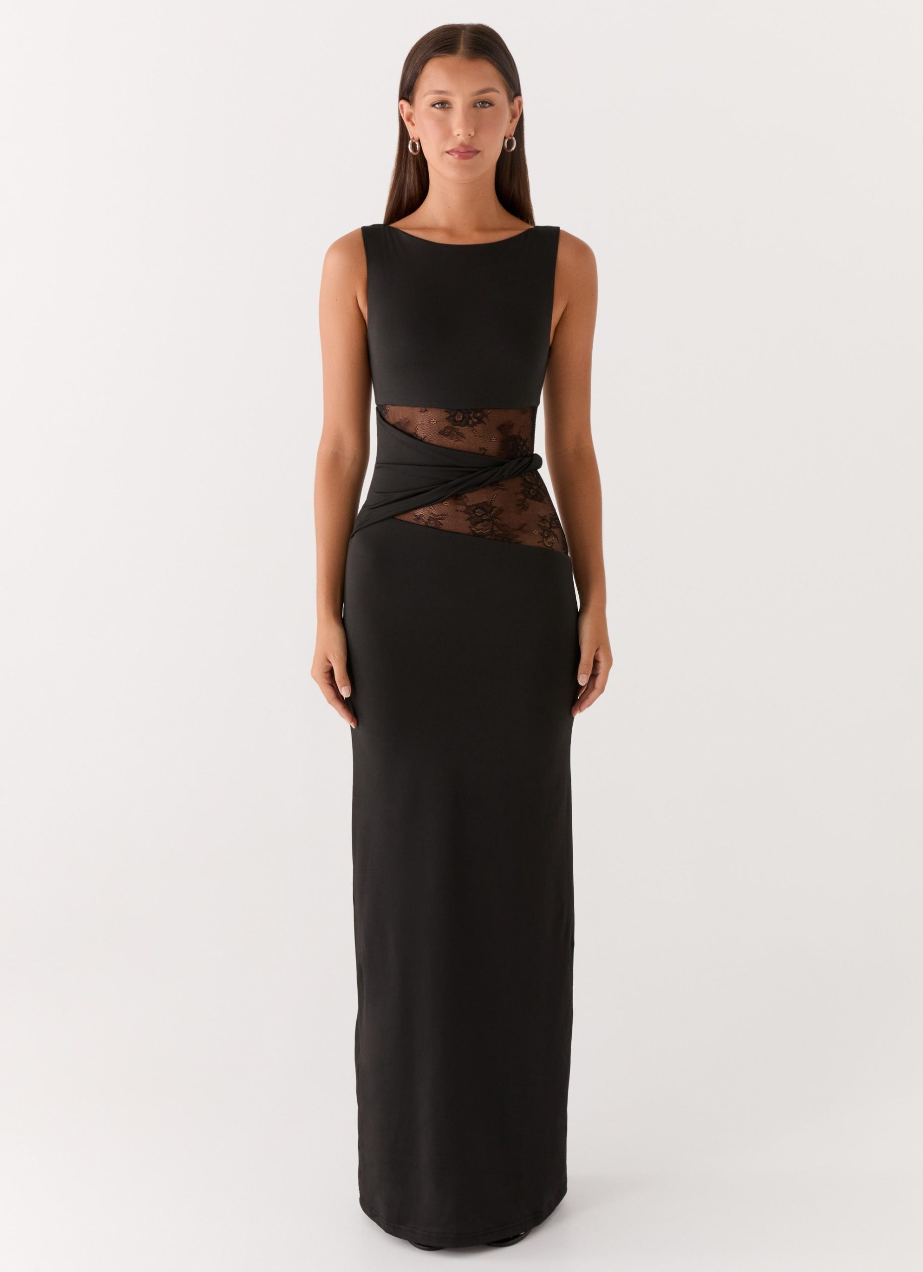 The Karma Maxi Dress is made for golden hour elevation and nights that demand unforgettable allure. Featuring a sophisticated rounded neckline and a sleek stretch jersey fit. this silhouette is artfully interrupted by a delicate semi-sheer lace waist and twisted waistband detailing. With a perfectly lined bodice and skirt. it balances comfort with a daring edge. making it the ultimate statement piece for sunset-to-after-dark glamour.